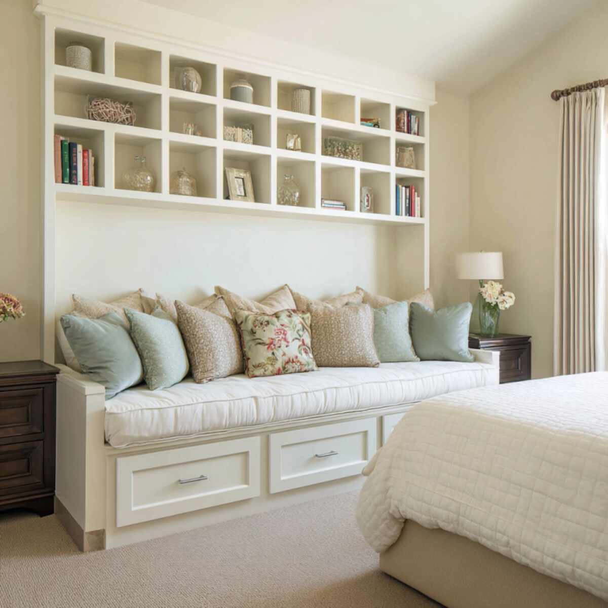 Built-in shelving benches are multifunctional Bedroom Storage Bench Ideas for organized living.