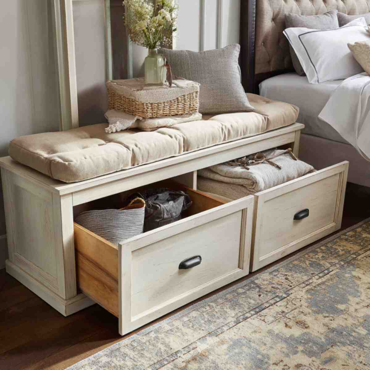 These Bedroom Storage Bench Ideas are excellent for storing bulky items discreetly.