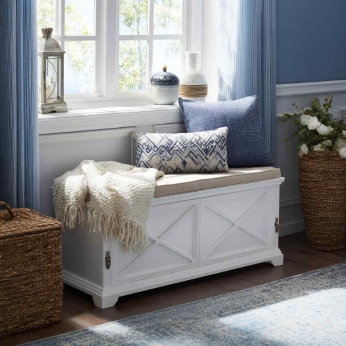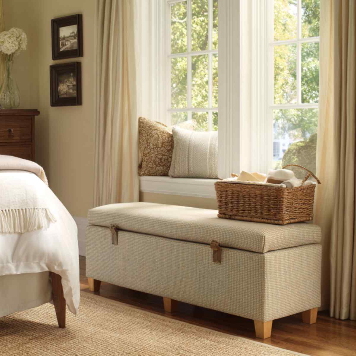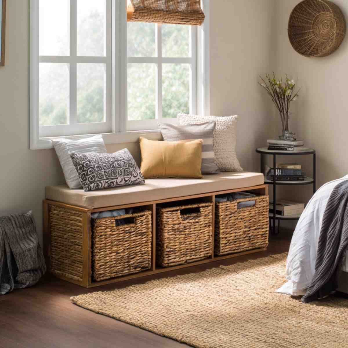 Benches with woven baskets are charming Bedroom Storage Bench Ideas that add texture.