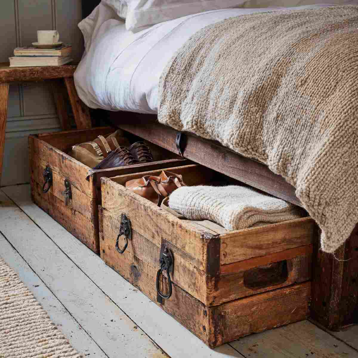 Vintage crate drawers bring a rustic and charming appeal to your room while offering practical under-bed storage. Their repurposed look adds personality to your space, making them unique Bedroom Under Bed Drawer Ideas.