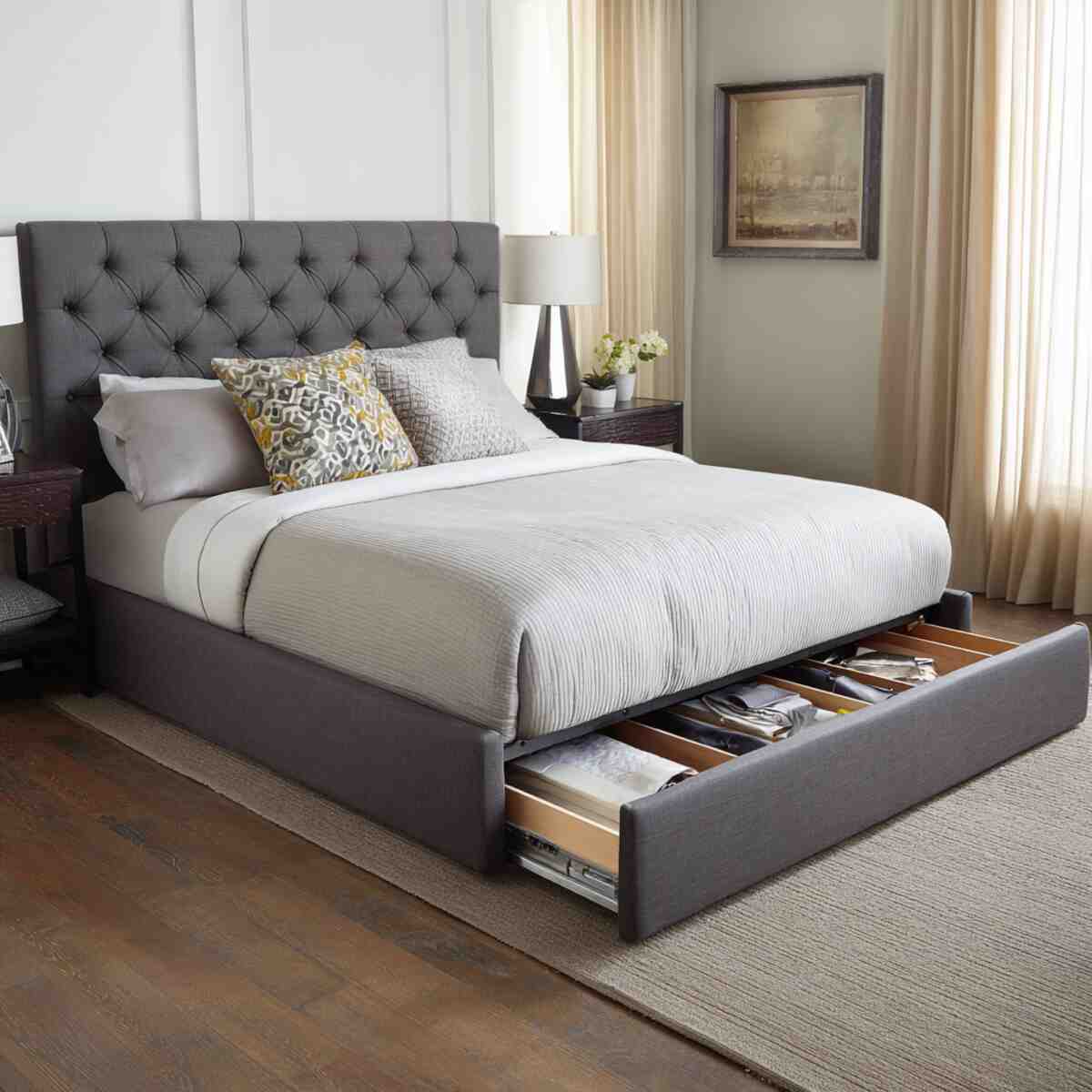 An upholstered bed with built-in drawers offers both comfort and hidden functionality.