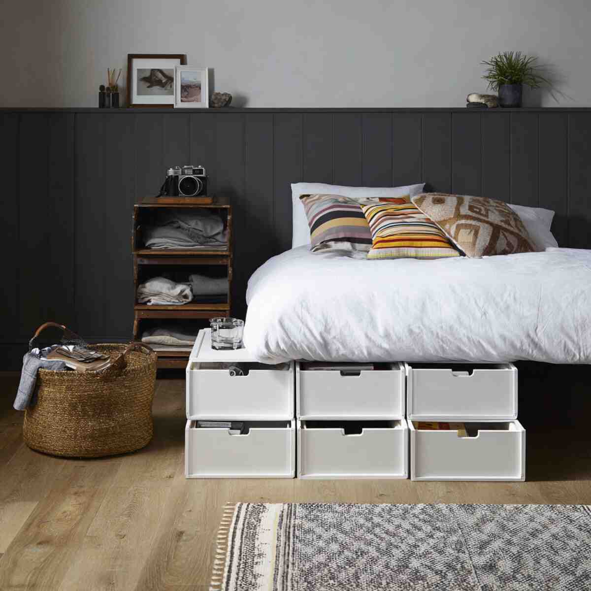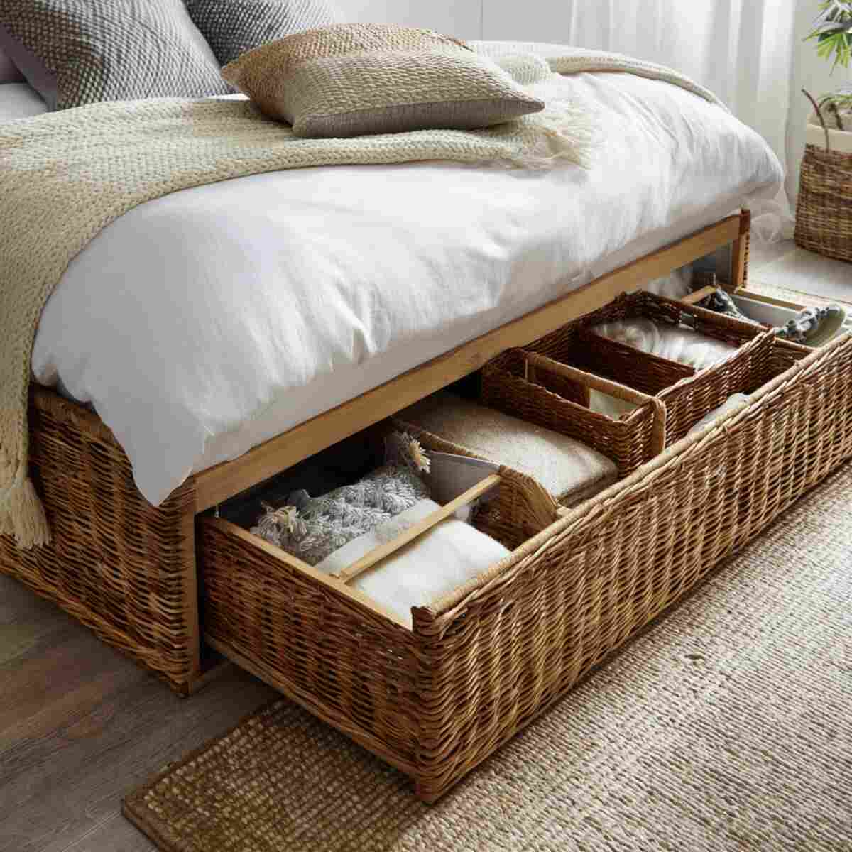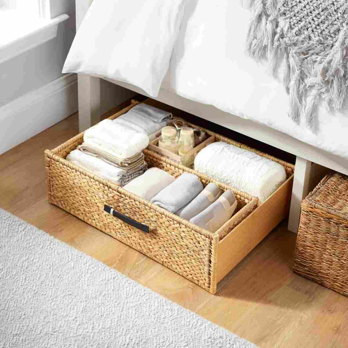 Woven rattan bins add a natural, cozy feel to your bedroom while offering hidden storage under the bed.
