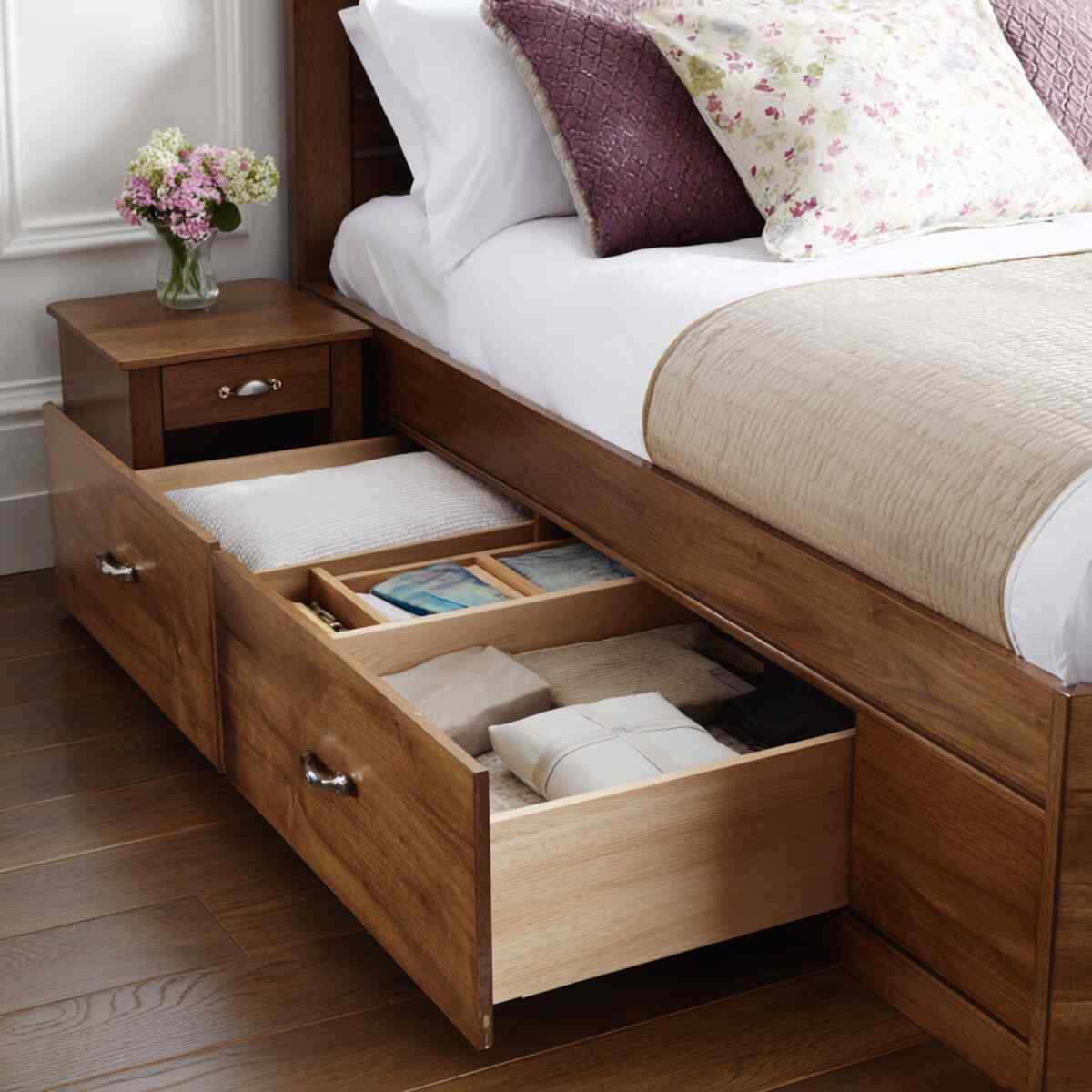 These drawers are often made from solid wood, matching your bed frame and room décor effortlessly. They’re perfect for storing extra bedding, blankets, or clothing while keeping your bedroom looking tidy and well-organized.