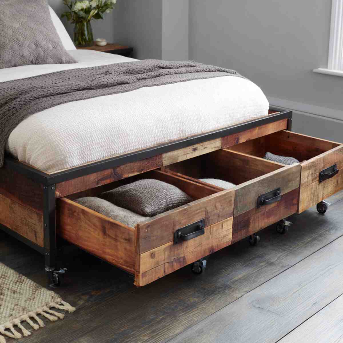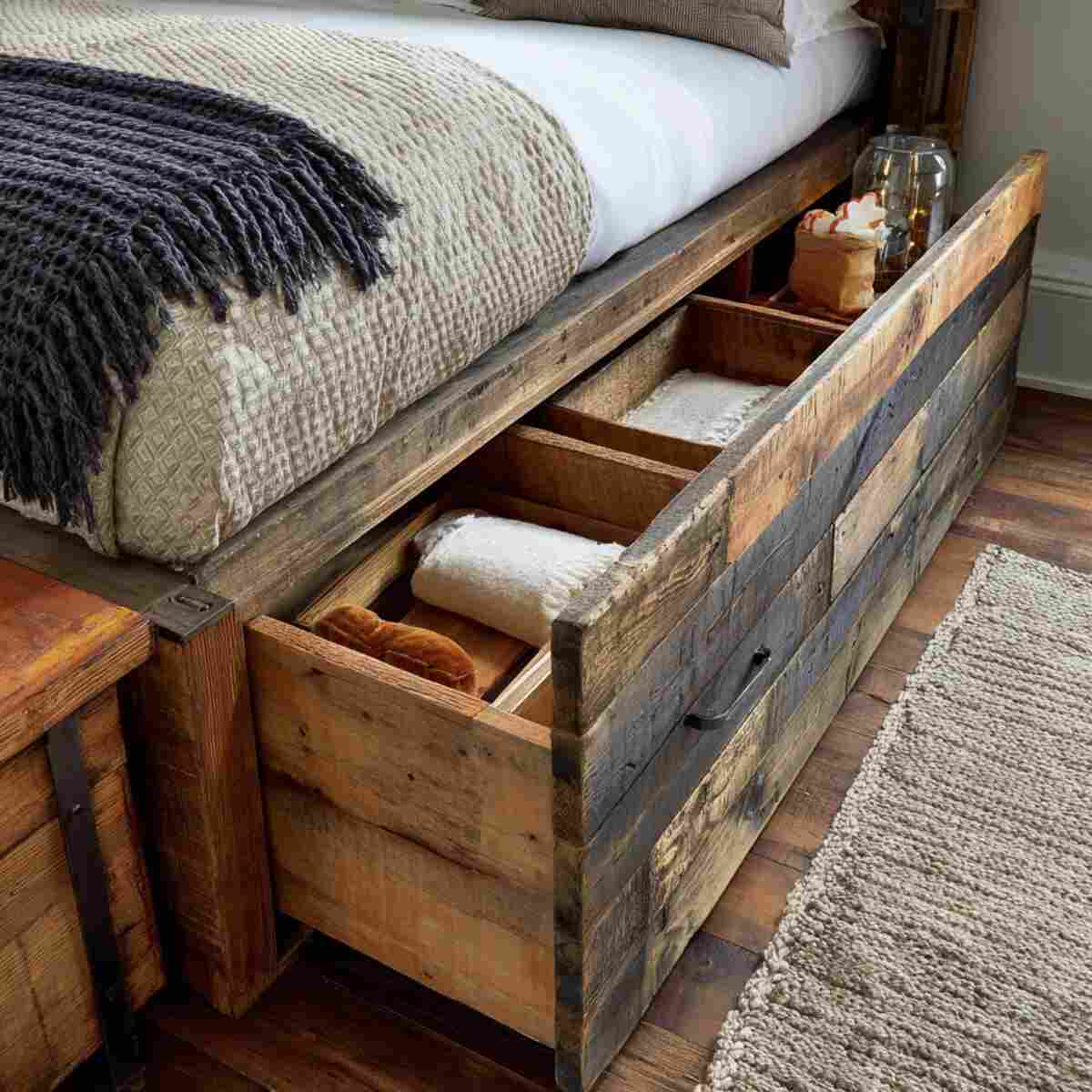 Each piece carries a unique, rustic look that pairs beautifully with farmhouse or vintage décor. These eco-friendly Bedroom Under Bed Drawer Ideas make your room both functional and environmentally conscious.