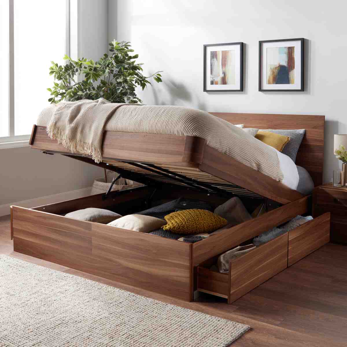 A lift-up platform bed is a genius idea for those who need deep storage but want to keep it hidden. By lifting the mattress, you access a spacious compartment ideal for storing bulky items like quilts or pillows.