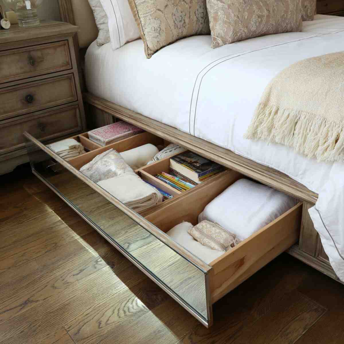 Mirrored drawers create an illusion of space while doubling as hidden storage units. Their reflective surface brightens up small rooms, making them ideal Bedroom Under Bed Drawer Ideas for compact spaces.