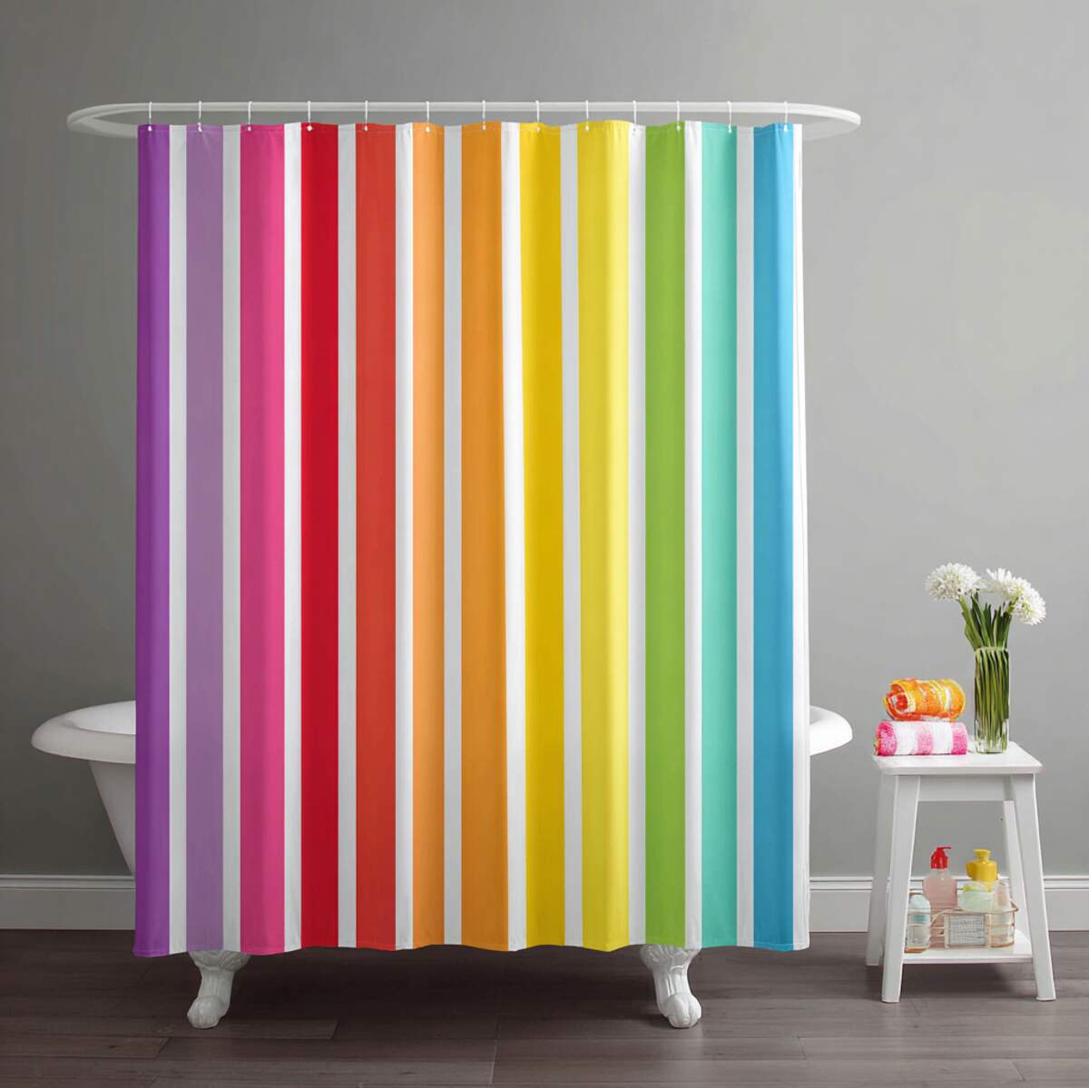 A striped rainbow shower curtain is one of the happiest Bold Pattern Shower Curtain Ideas that can brighten up any dull bathroom.