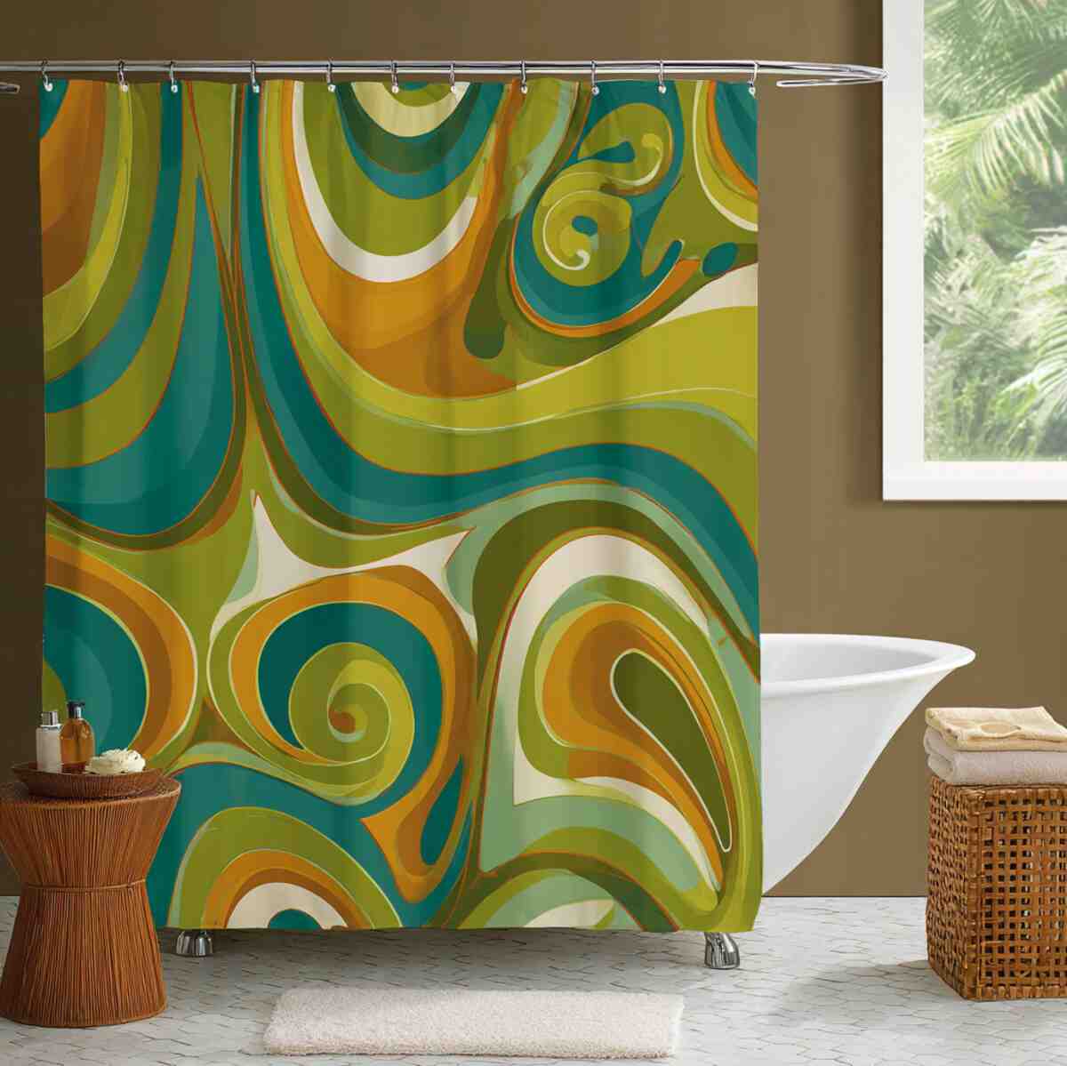 Retro swirl patterns inspired by the 70s are back and make nostalgic yet trendy Bold Pattern Shower Curtain Ideas.