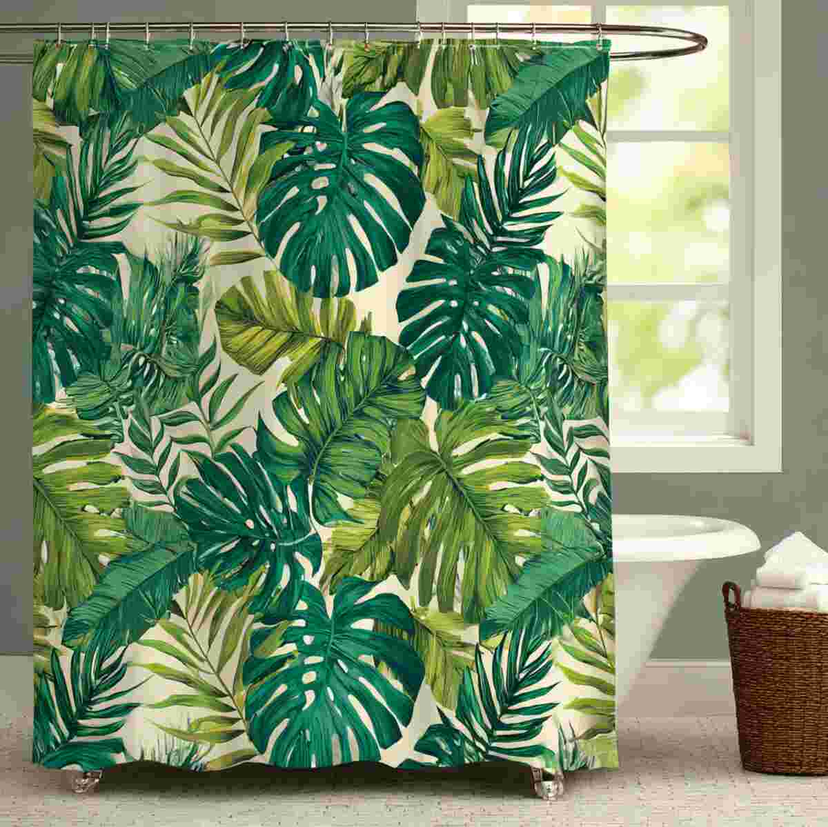 Tropical leaf designs are perfect Bold Pattern Shower Curtain Ideas for bringing a fresh, lively atmosphere into your bathroom. The rich greens and leafy patterns mimic a lush jungle, instantly energizing your morning routine.