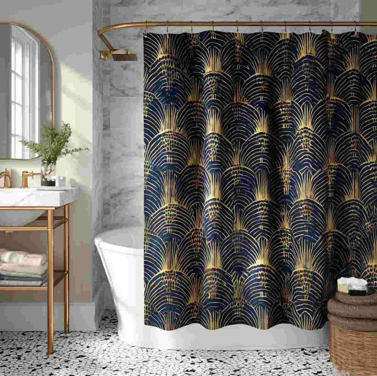 For those who love elegance with a touch of glamour, a navy and gold Art Deco design is one of the most striking Bold Pattern Shower Curtain Ideas.