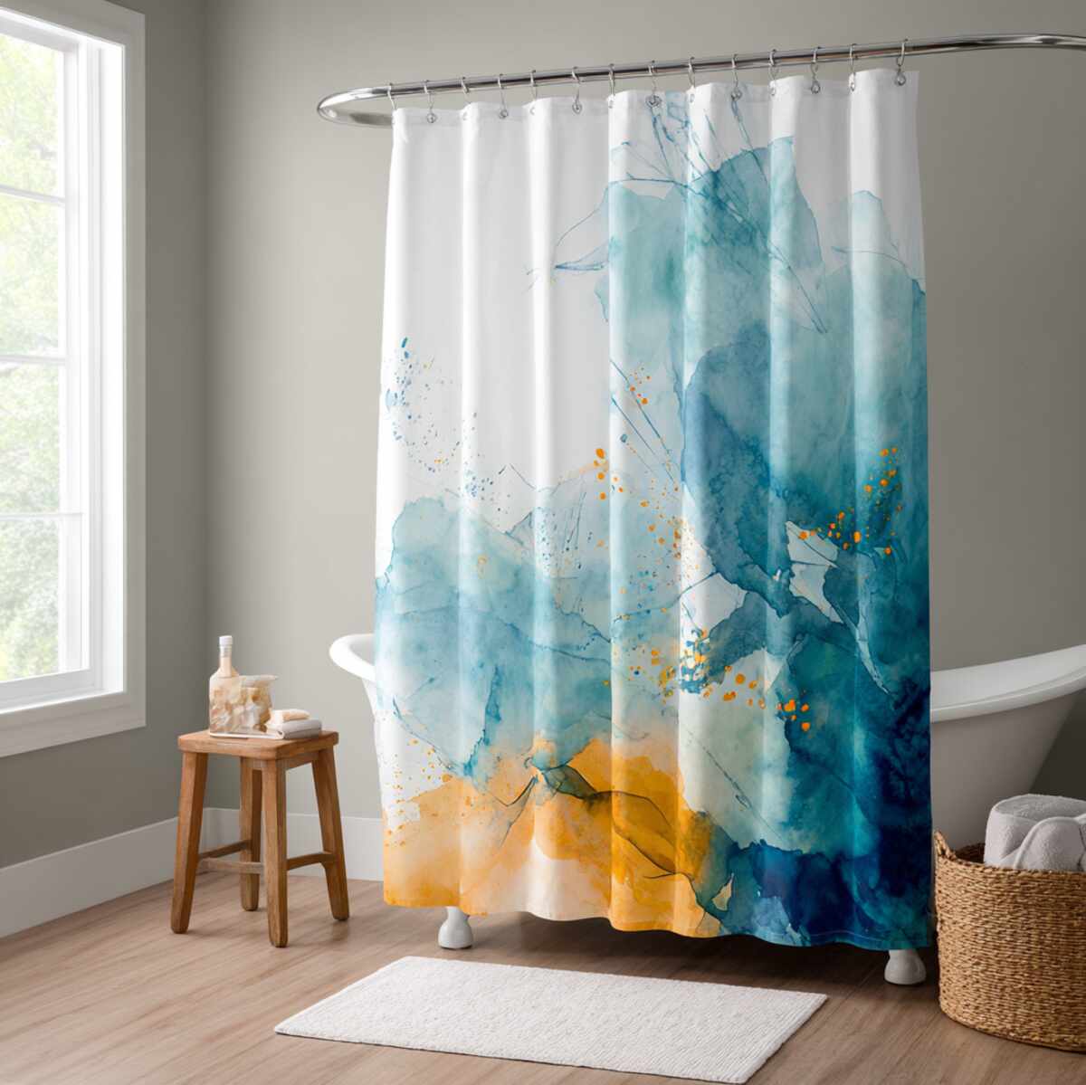 Abstract watercolor splashes bring artistic flair and creativity, making them stand out as unique Bold Pattern Shower Curtain Ideas. The soft blend of colors gives a dynamic look that feels modern yet calming.