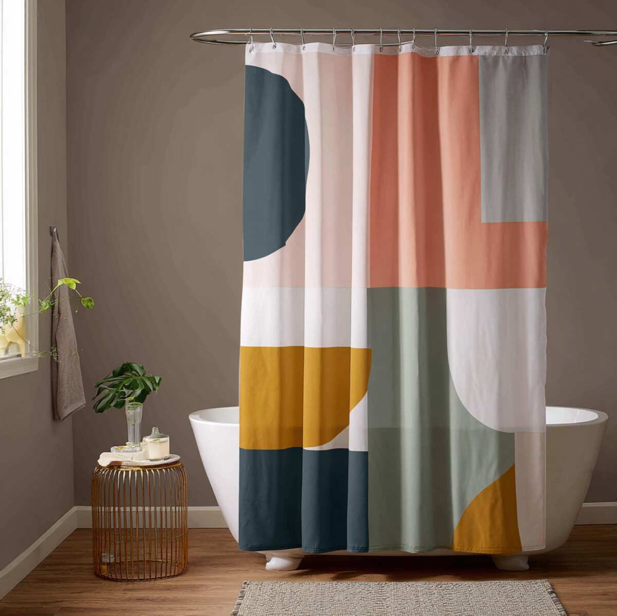 A color-blocked curtain offers one of the most modern Bold Pattern Shower Curtain Ideas with its clean lines and contrasting tones.