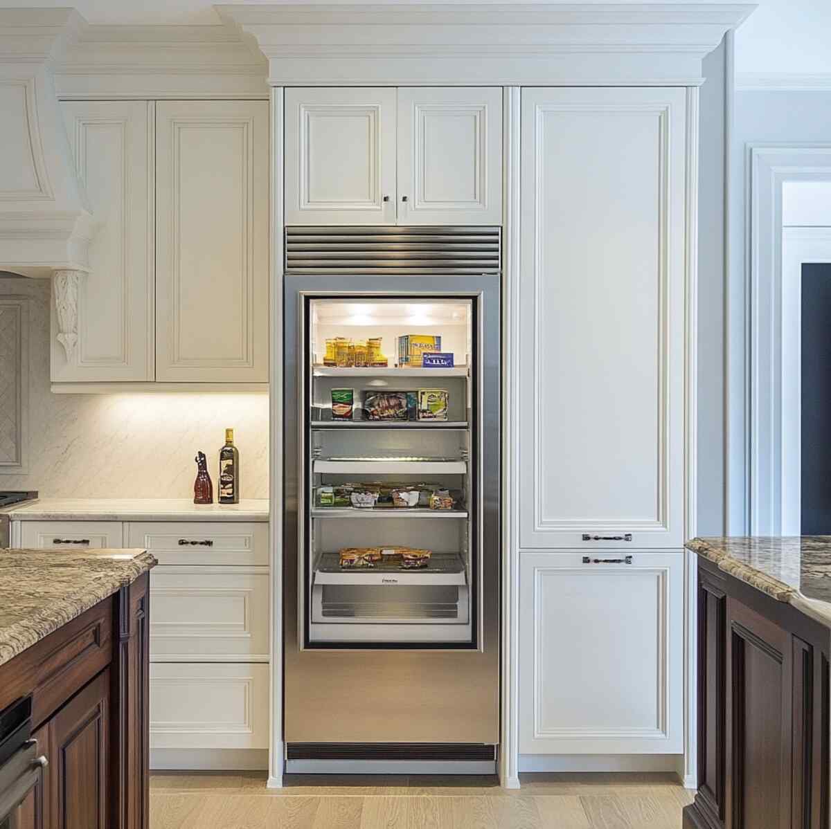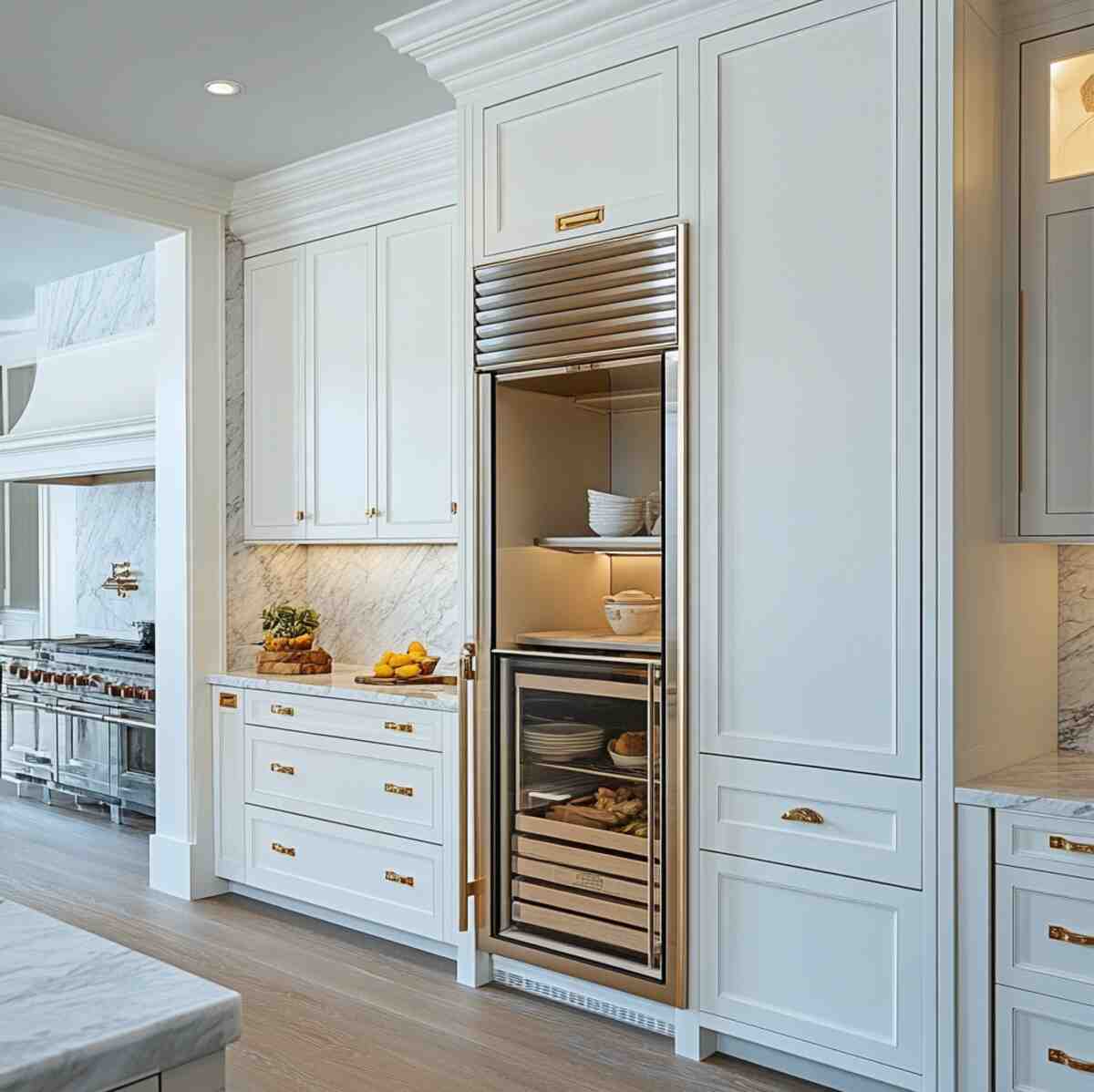 These cabinets are great for storing seasonal items or less-used kitchen tools while making the fridge look fully built into the cabinetry. It’s a practical and space-efficient addition to your list of Built-In Fridge Cabinet Ideas.