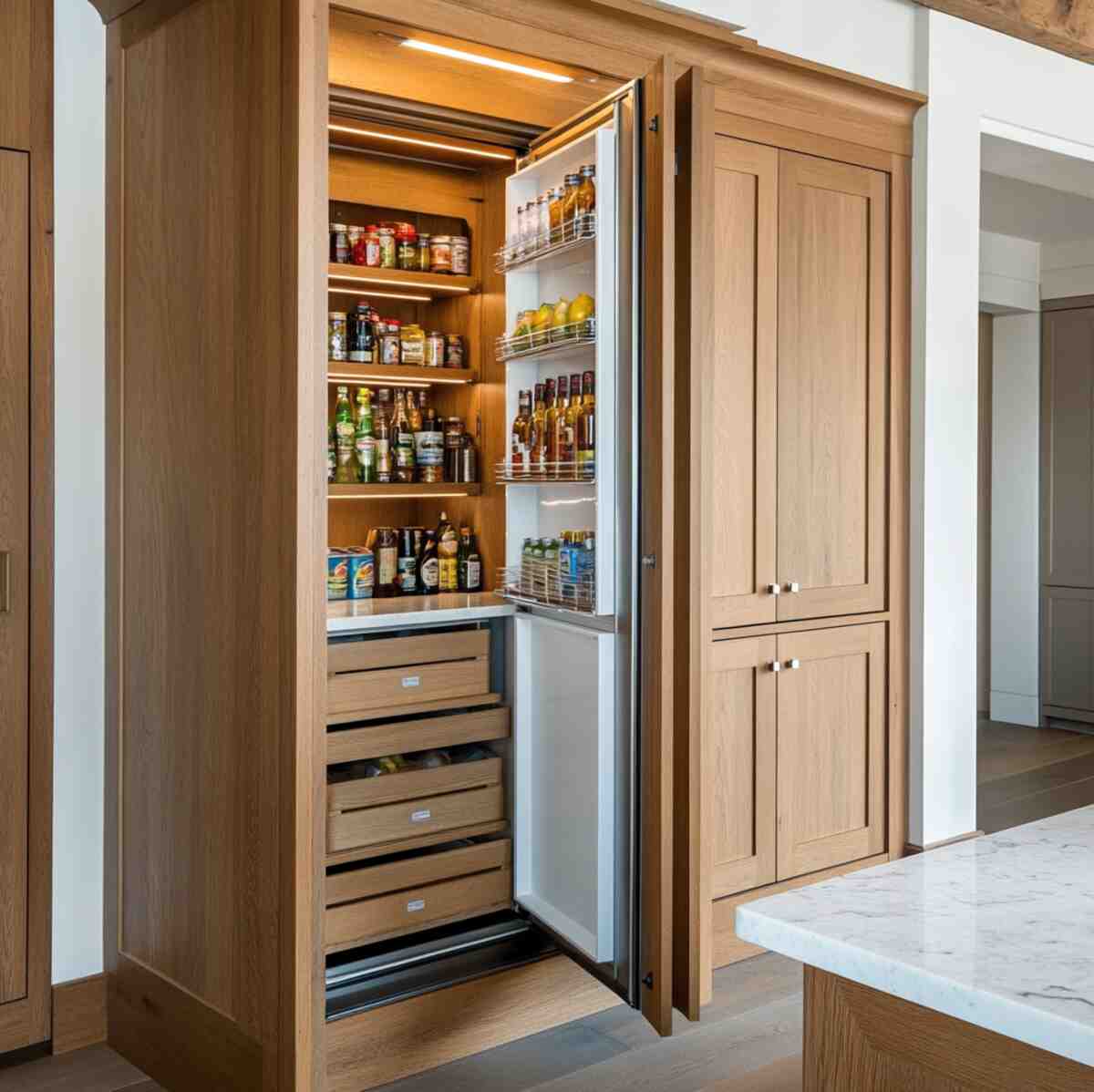 This approach makes your kitchen feel more organized because everything blends neatly into one vertical line. It’s one of the most effective Built-In Fridge Cabinet Ideas for maximizing storage while keeping your space streamlined.