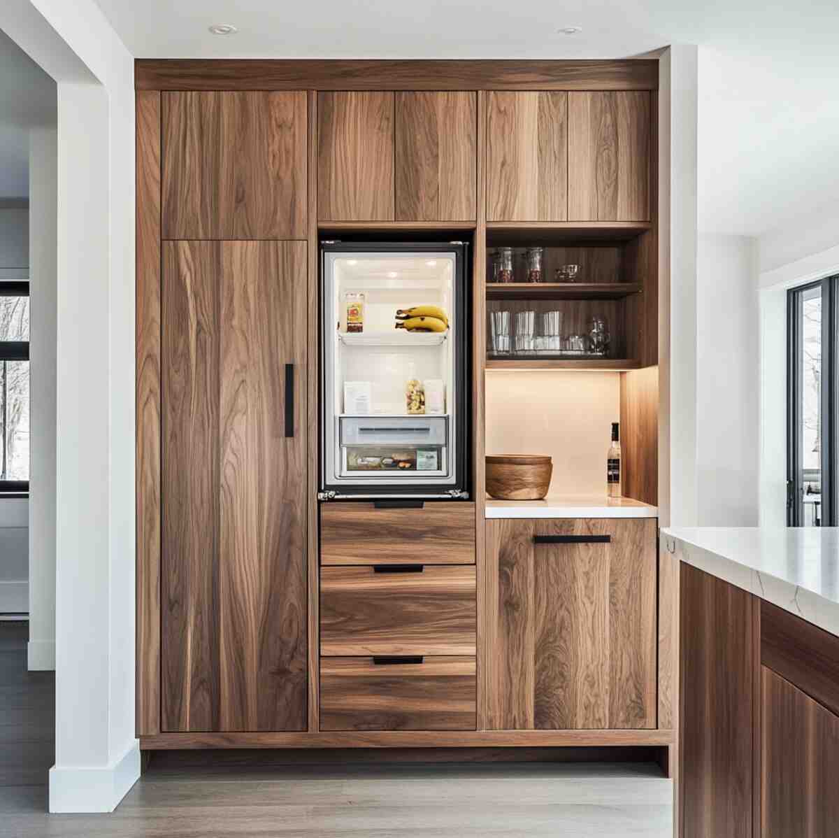 It’s a versatile choice among Built-In Fridge Cabinet Ideas because it mixes practical storage with visual interest.