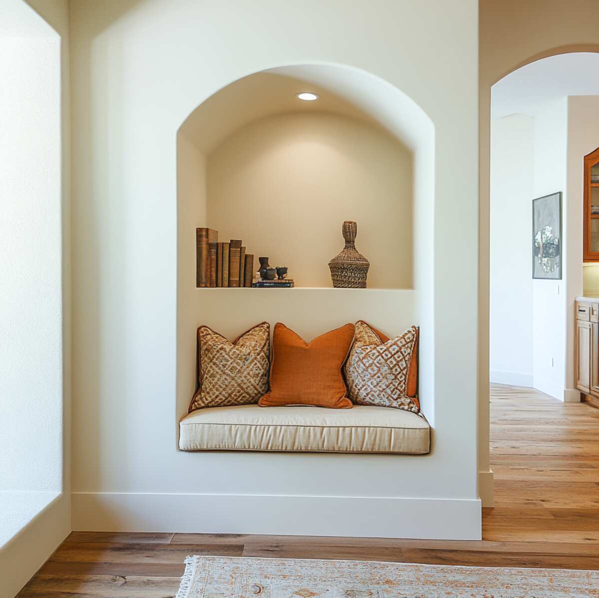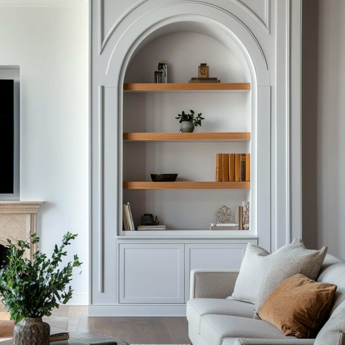 An arched display niche adds a soft, timeless curve to your space, making it one of the most stylish Built-In Wall Niche Ideas for Living Rooms.