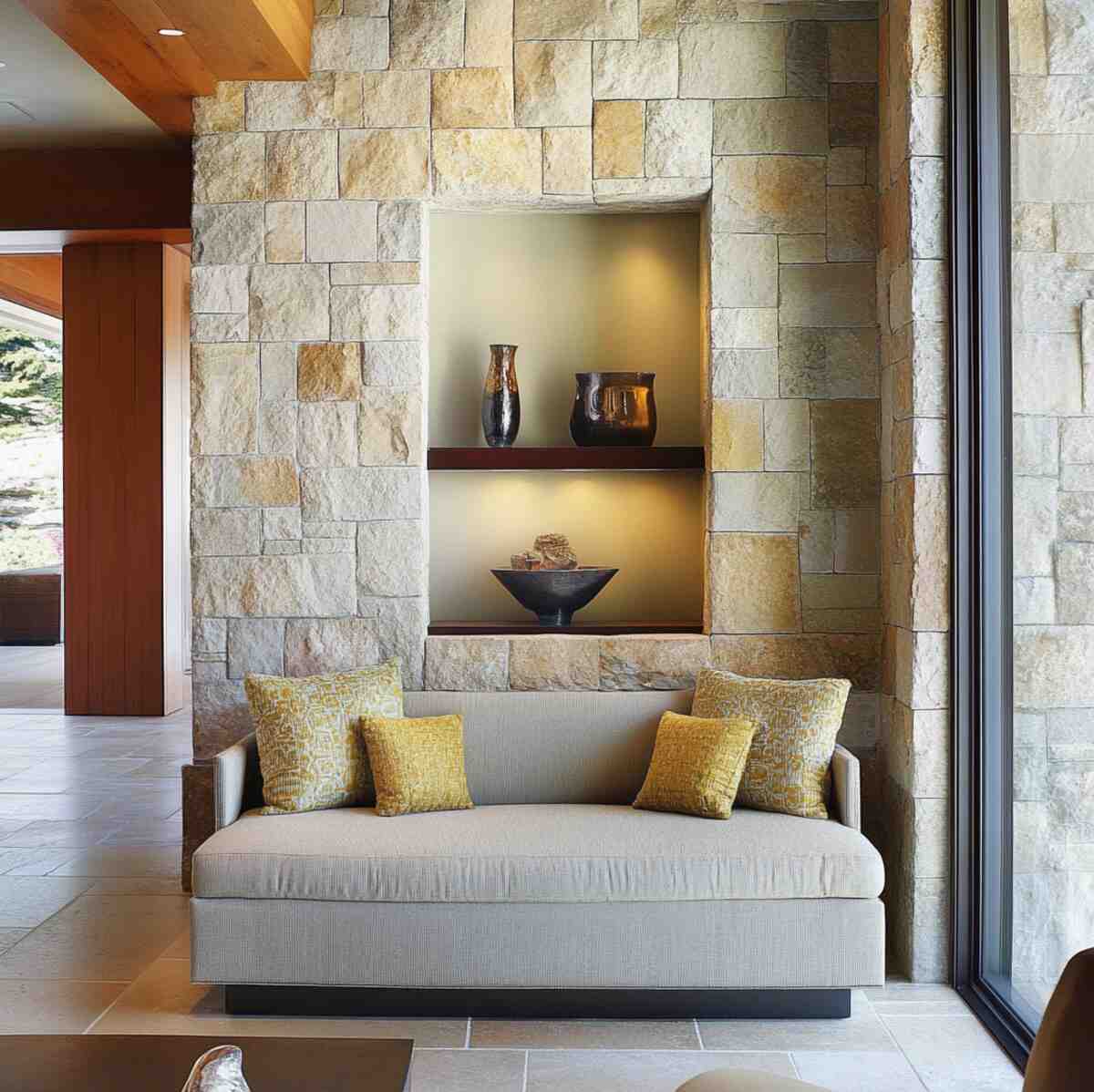 A stone-clad statement niche brings an earthy, textured feel into the living room. As part of Built-In Wall Niche Ideas for Living Rooms, it adds instant character and can make a simple wall feel like a feature piece.