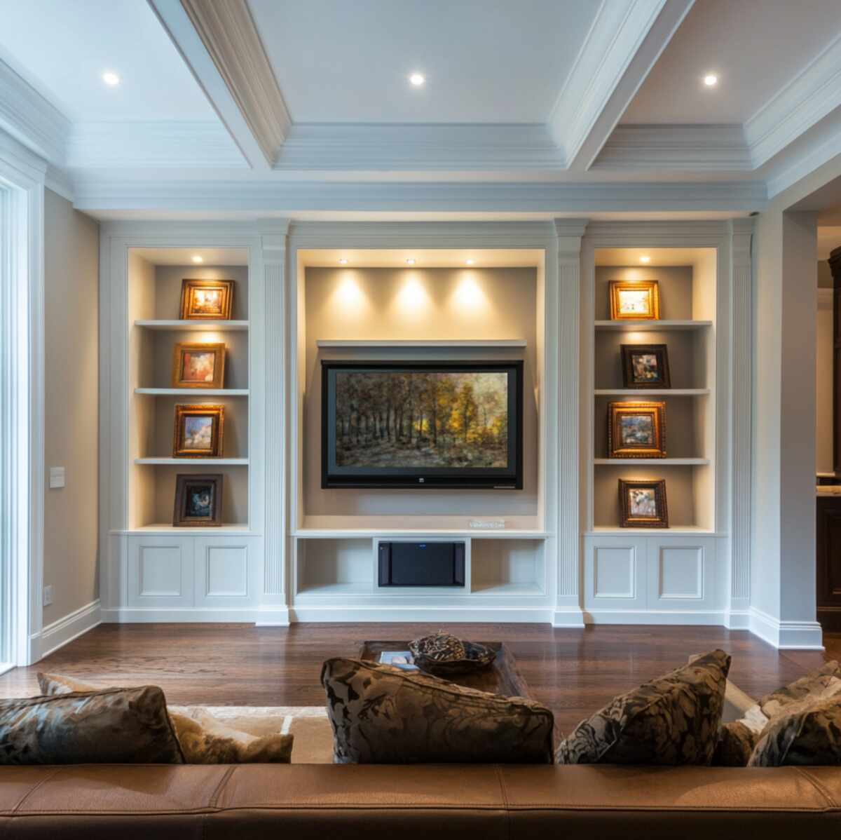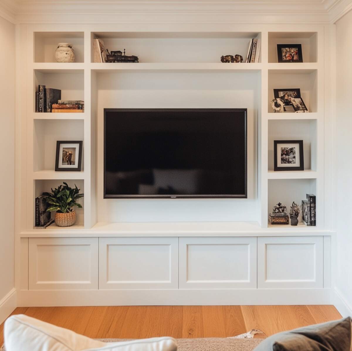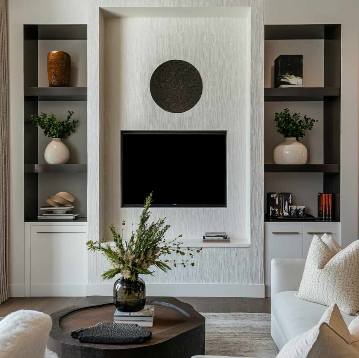A TV-frame niche with storage creates a clean, streamlined space by recessing the TV into the wall and adding shelving around it.