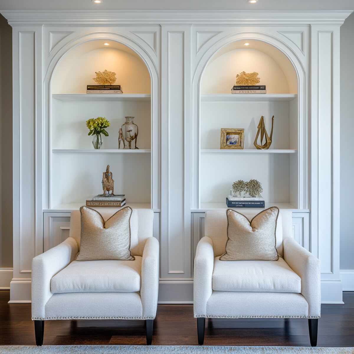 Symmetrical twin niches bring perfect balance to any living room layout. These matching features make great use of wall space, which is why they’re often recommended in Built-In Wall Niche Ideas for Living Rooms.