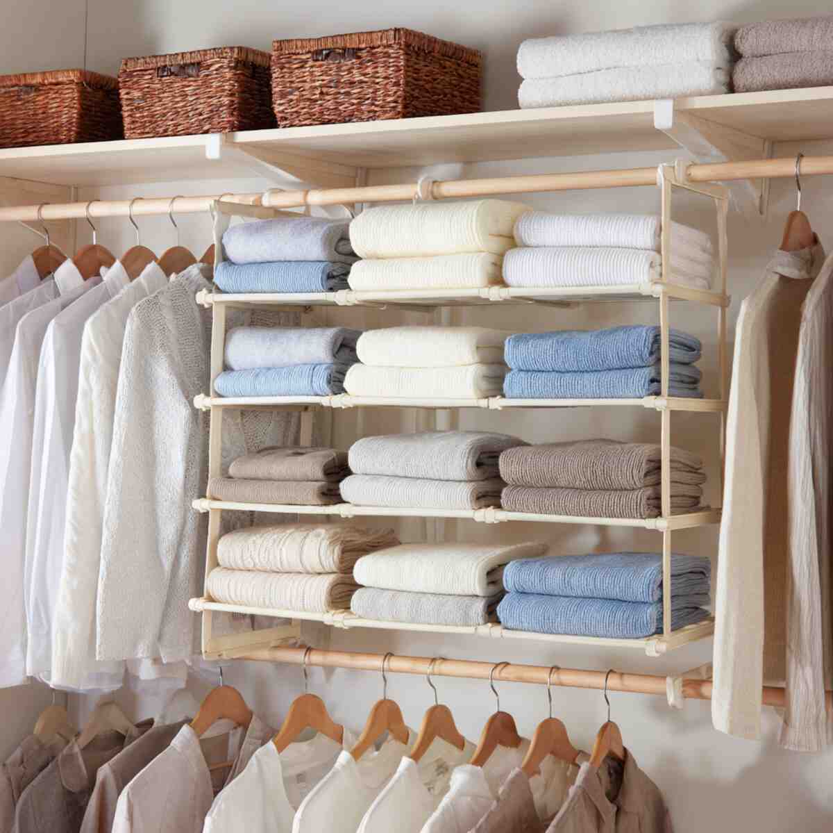 They help divide vertical space into neat sections, making it simple to store folded clothes, towels, or accessories. These Closet Hanging Shelf Ideas are especially important for renters since they add storage without drilling or permanent changes.