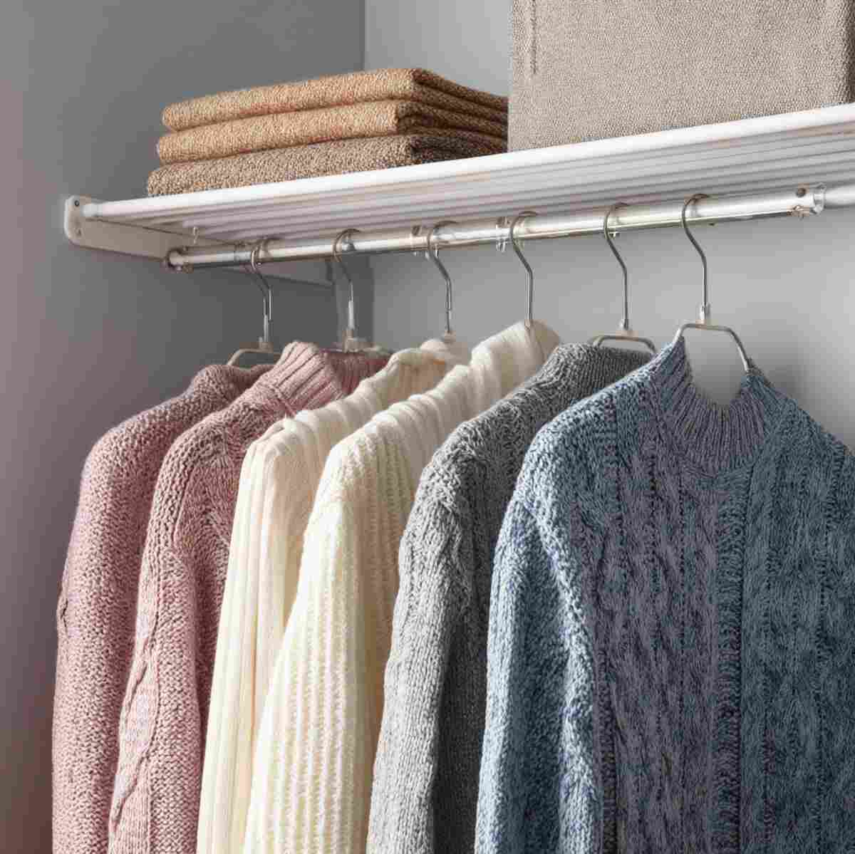 These Closet Hanging Shelf Ideas are designed to keep sweaters folded properly to prevent stretching.