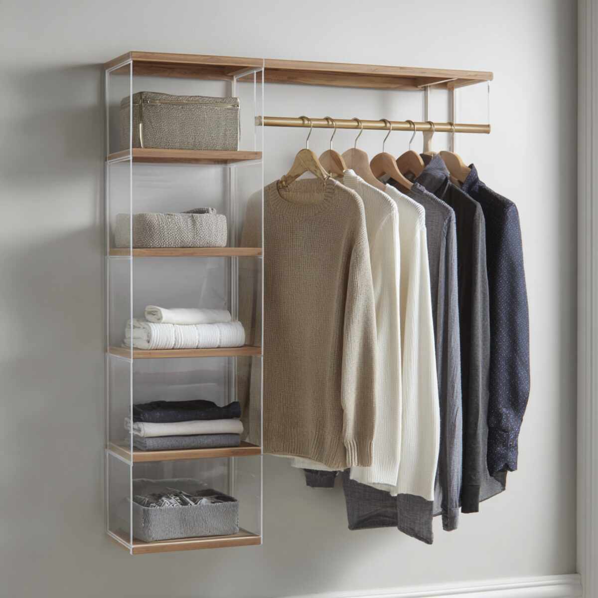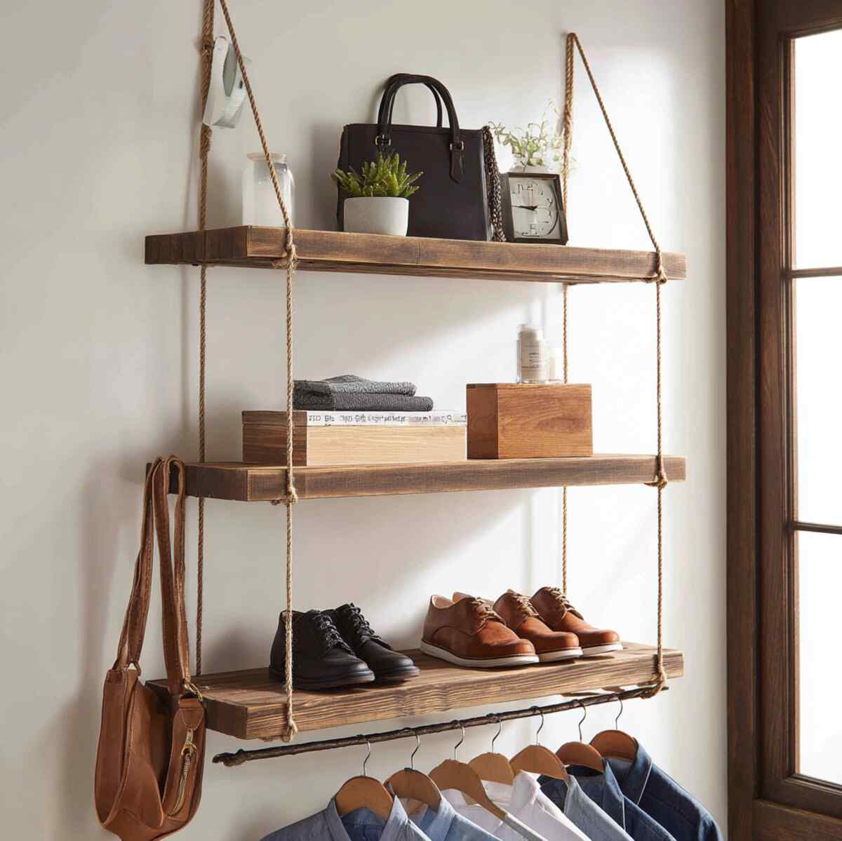 These Closet Hanging Shelf Ideas are important because they combine open shelving with discreet storage in one solution.