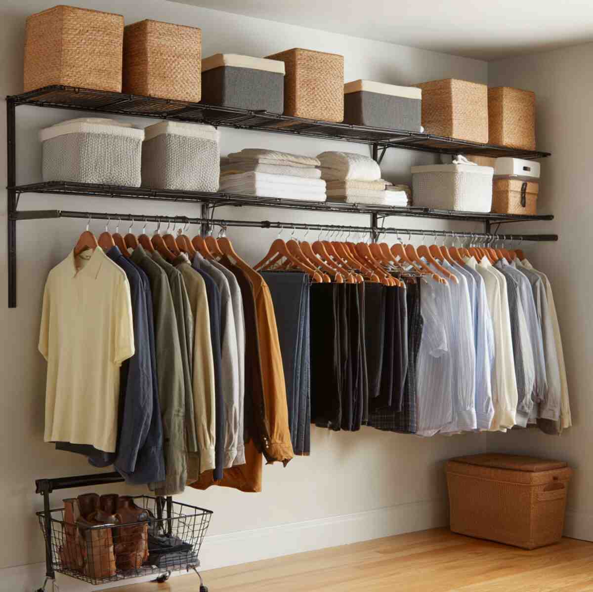 Wire systems are practical Closet Hanging Shelf Ideas that allow airflow and visibility inside the closet. They are ideal for storing folded clothes, shoes, or bins while keeping everything easy to see.