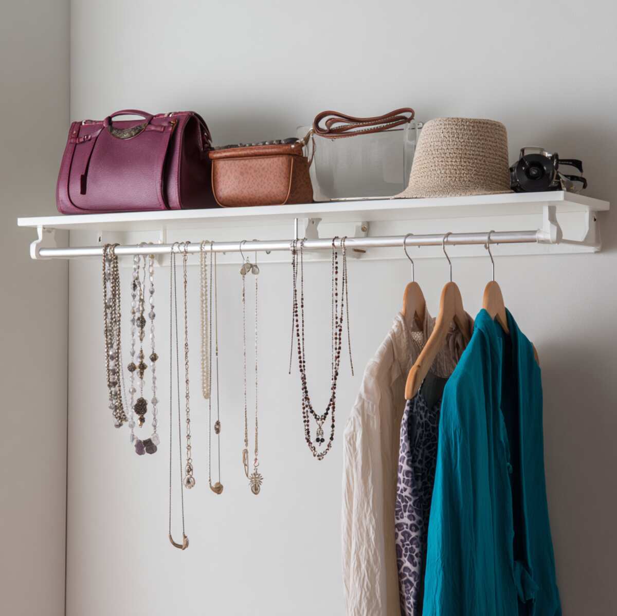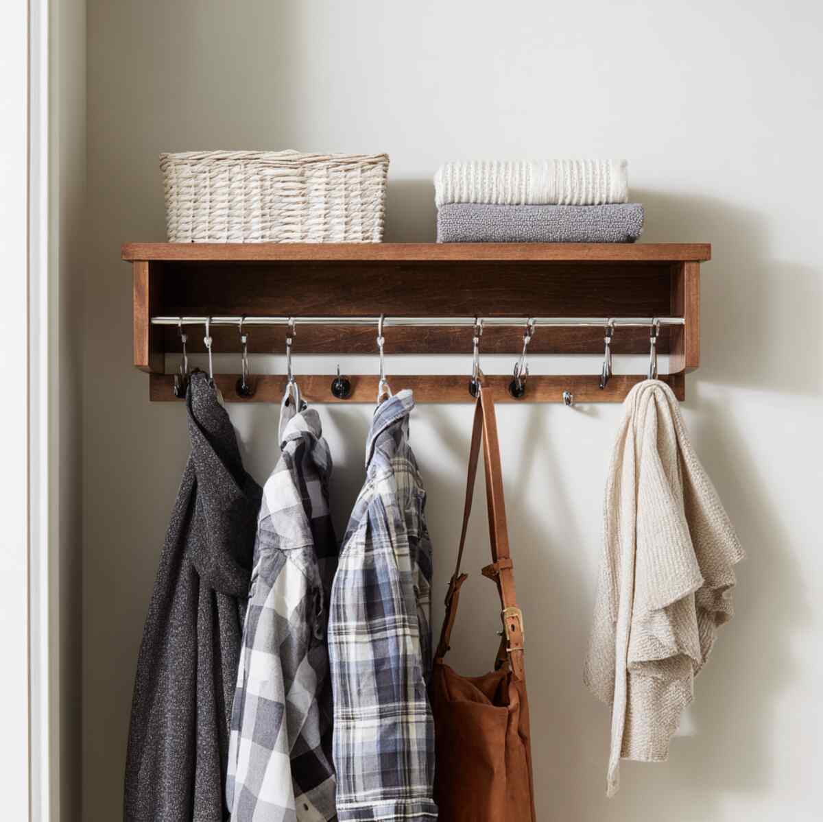 Hook-integrated designs are smart Closet Hanging Shelf Ideas that add extra hanging spots.