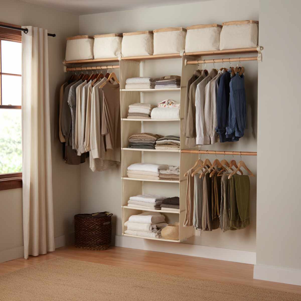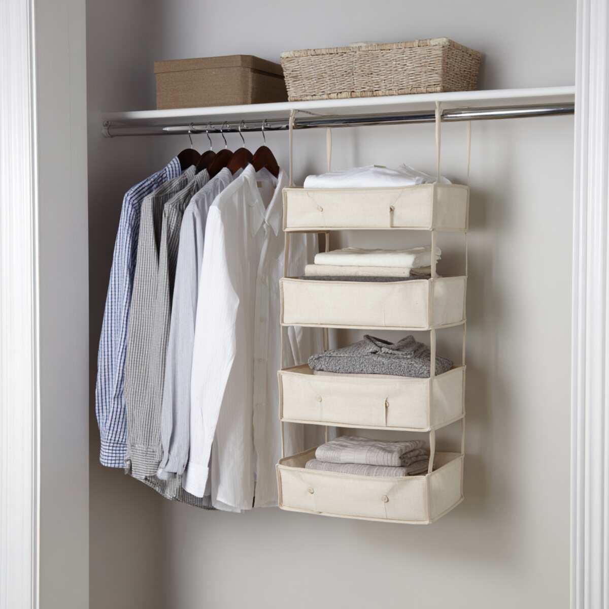 Canvas organizers are soft yet structured Closet Hanging Shelf Ideas that work well for everyday clothing storage. They help keep stacks of clothes separated, reducing mess and making items easier to find.