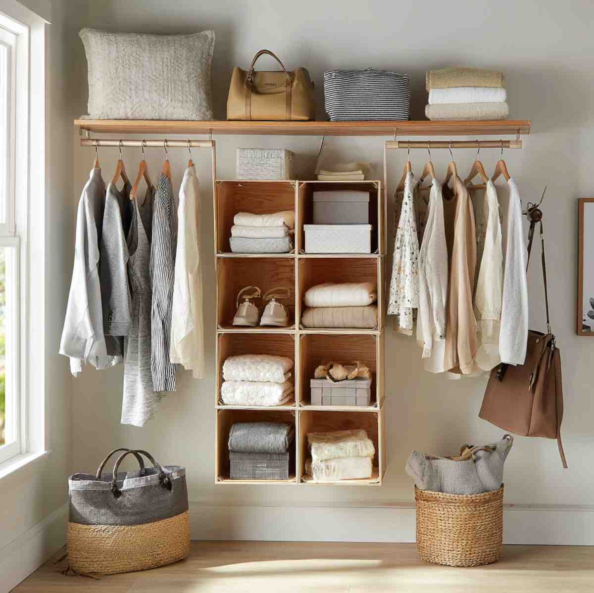 Cube-style units are smart Closet Hanging Shelf Ideas that create individual compartments for better organization. Each cube can hold a specific category, such as t-shirts, accessories, or kids’ clothing.