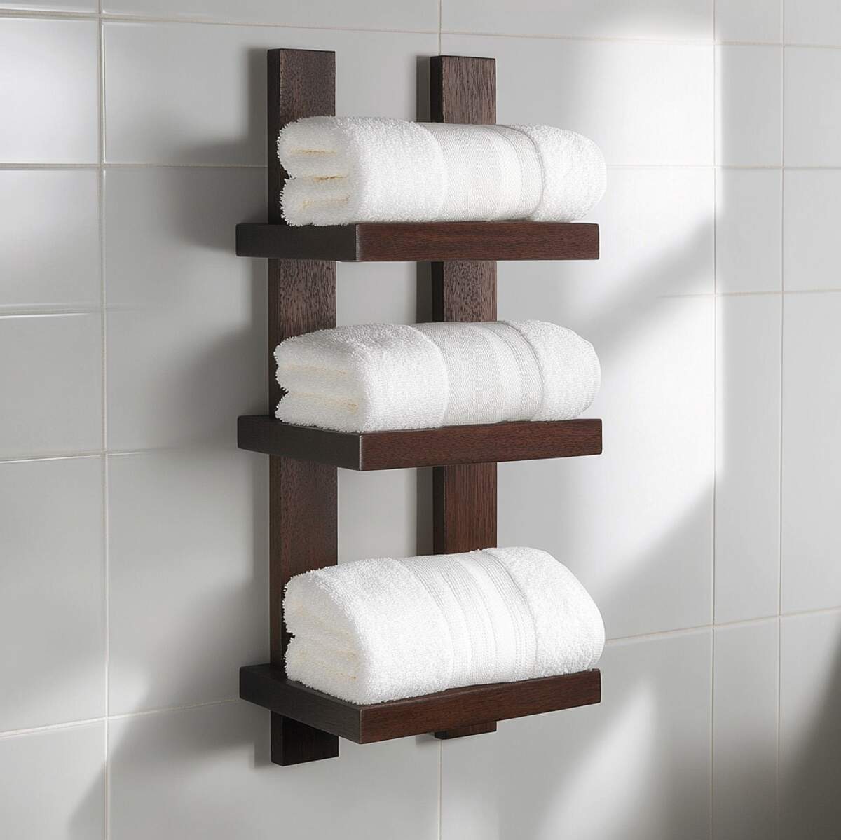 A slim vertical towel shelf stacks towels in a narrow footprint, making it ideal for bathrooms with limited width.