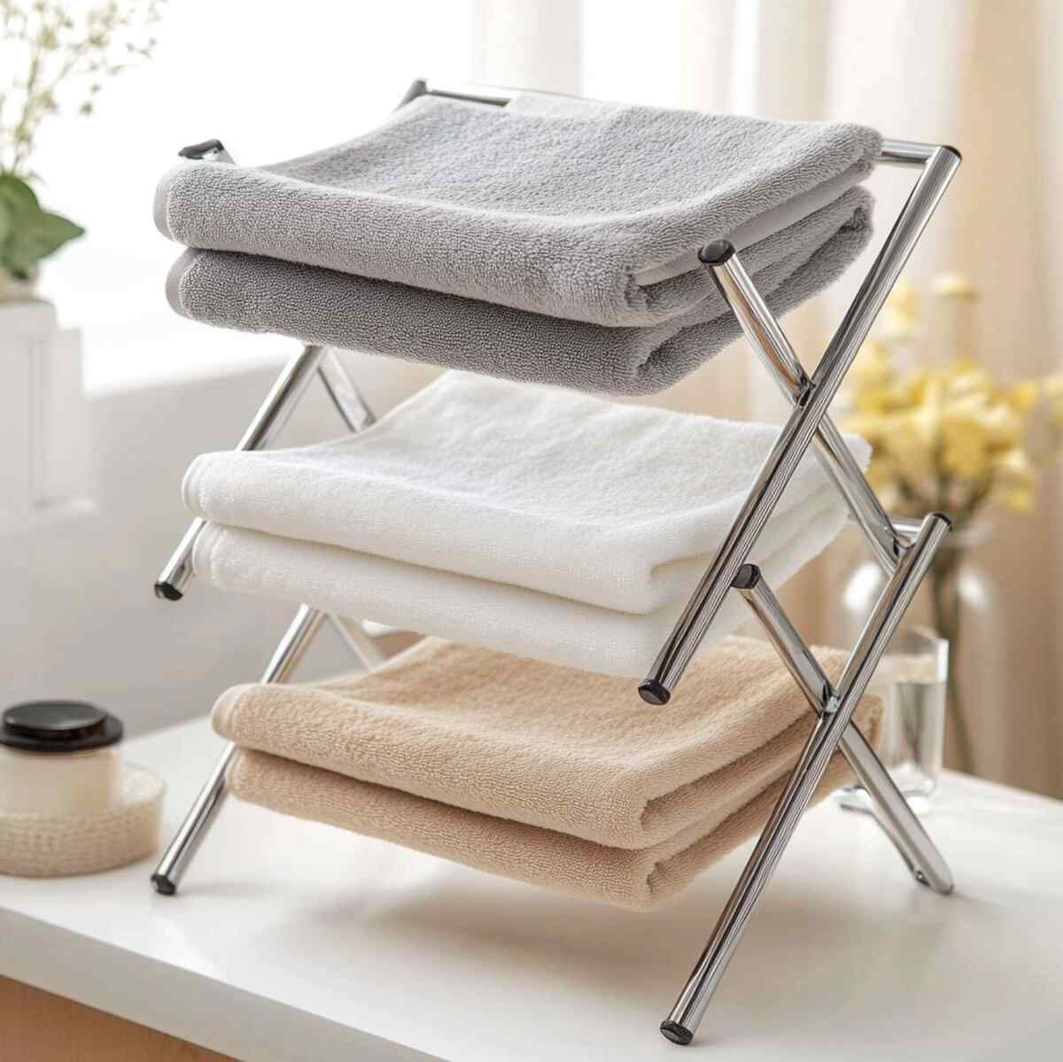 Foldable towel racks can be expanded when needed and folded away when not in use.