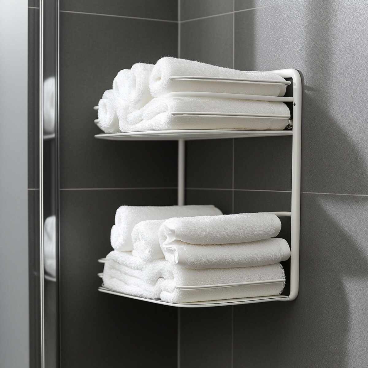Corner-mounted towel racks utilize unused corner space, turning awkward spots into practical storage.