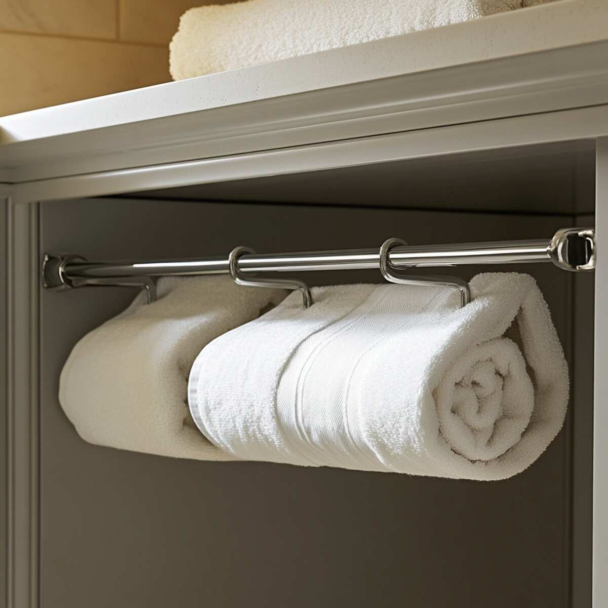 An under-cabinet towel rod attaches beneath a vanity or cabinet, offering discreet storage. It keeps towels out of sight but within easy reach, maintaining a clean look.