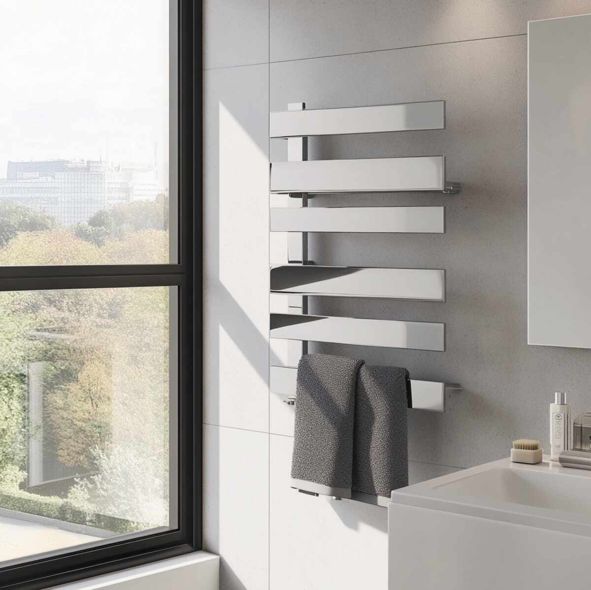 A heated slim towel rail warms towels while taking up minimal space, combining comfort with efficiency.