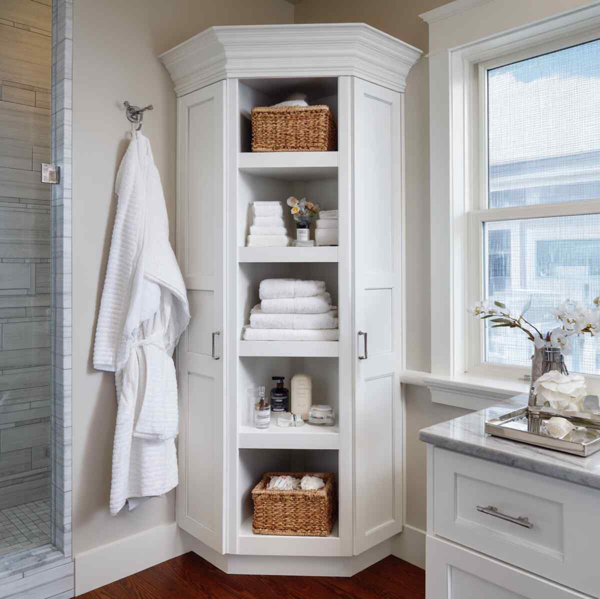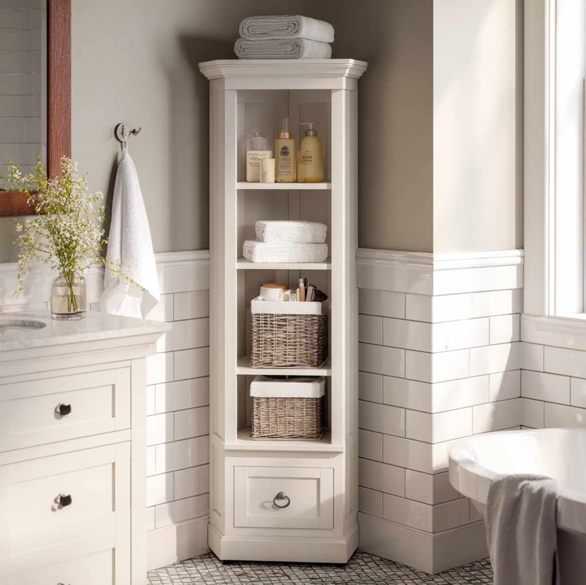 Built-in units are seamless Corner Storage Tower Ideas for Bathrooms designed for maximum efficiency.