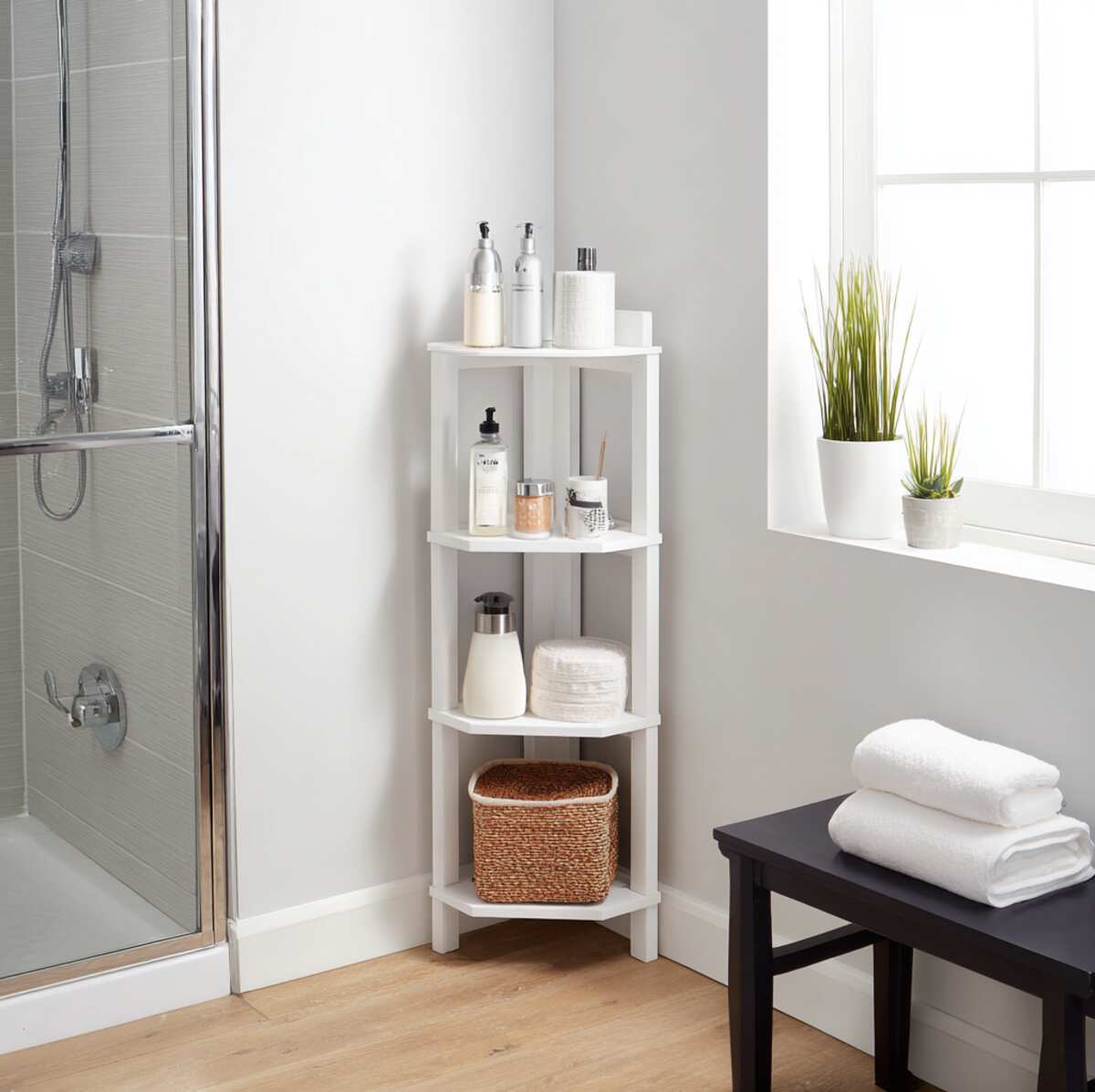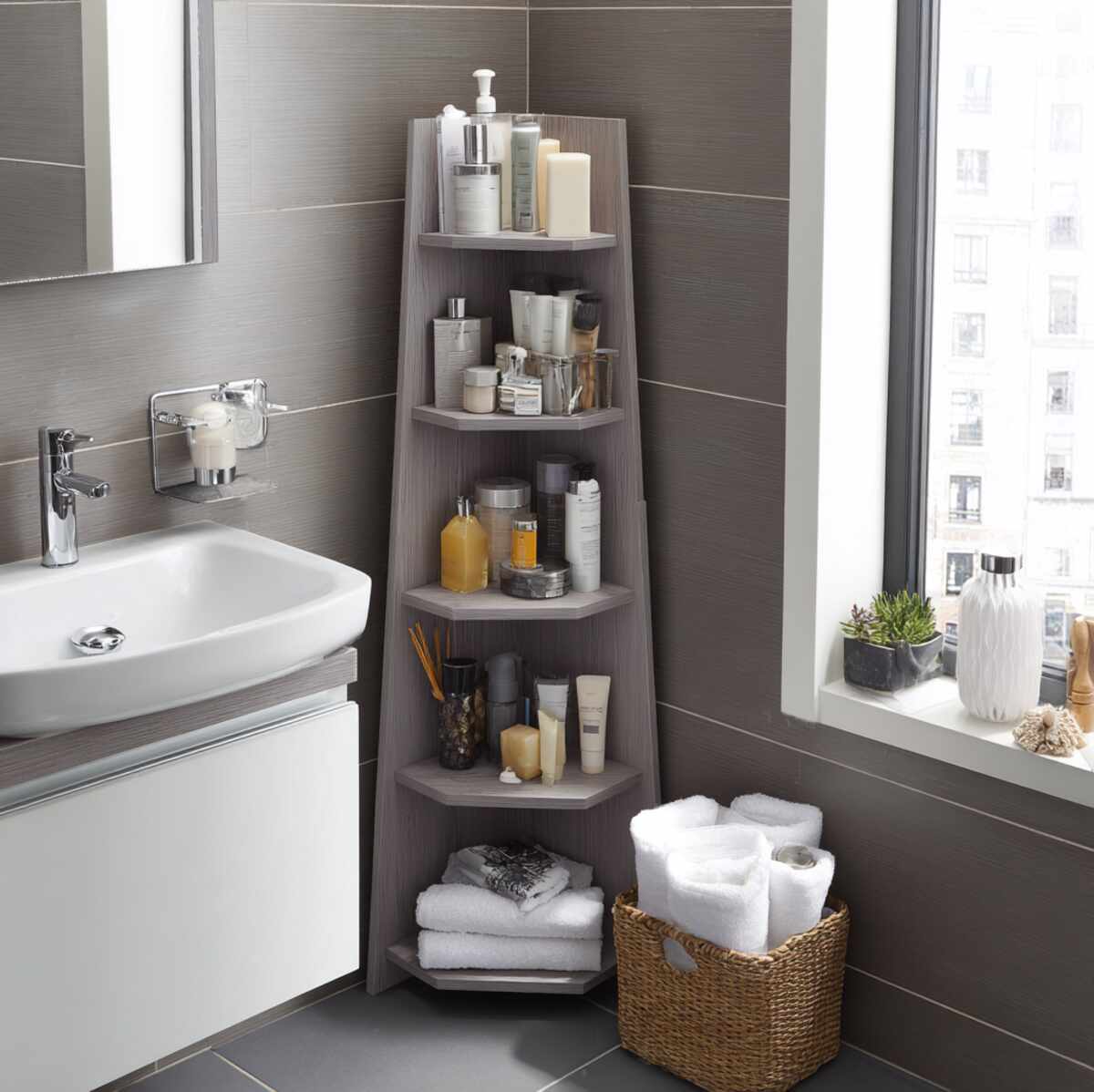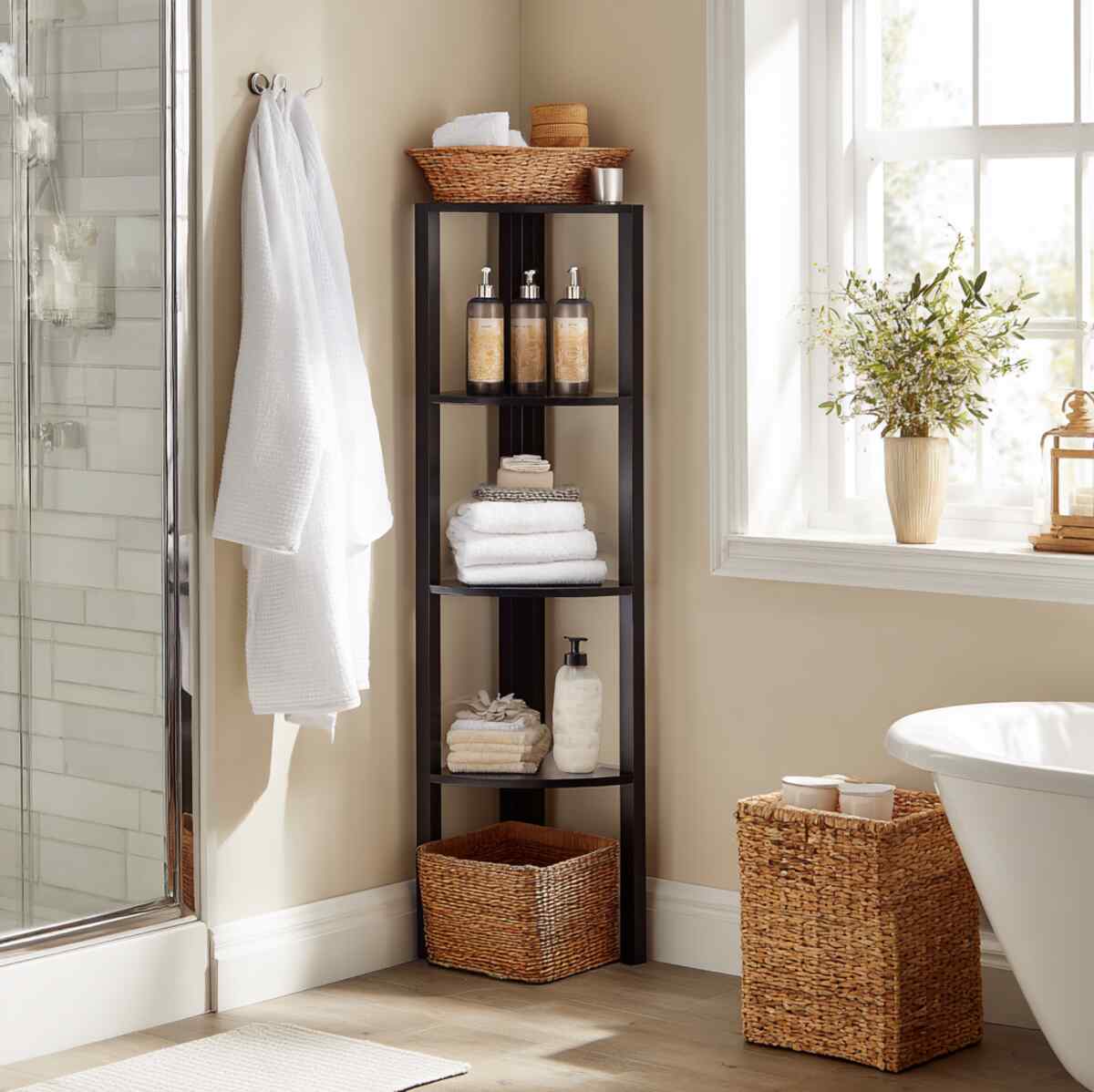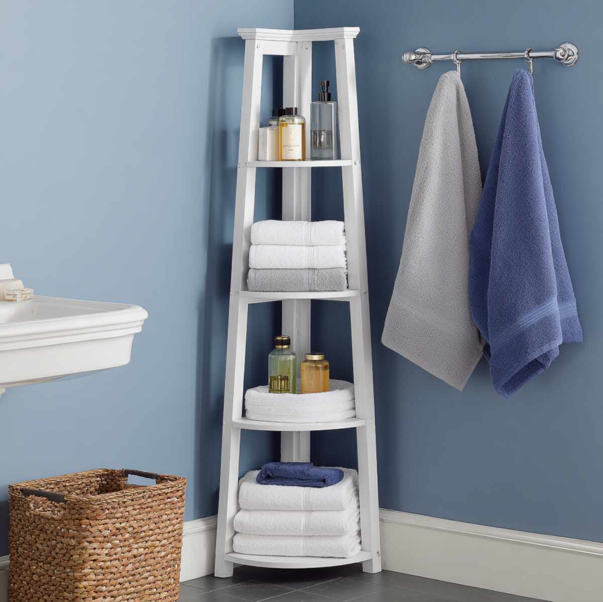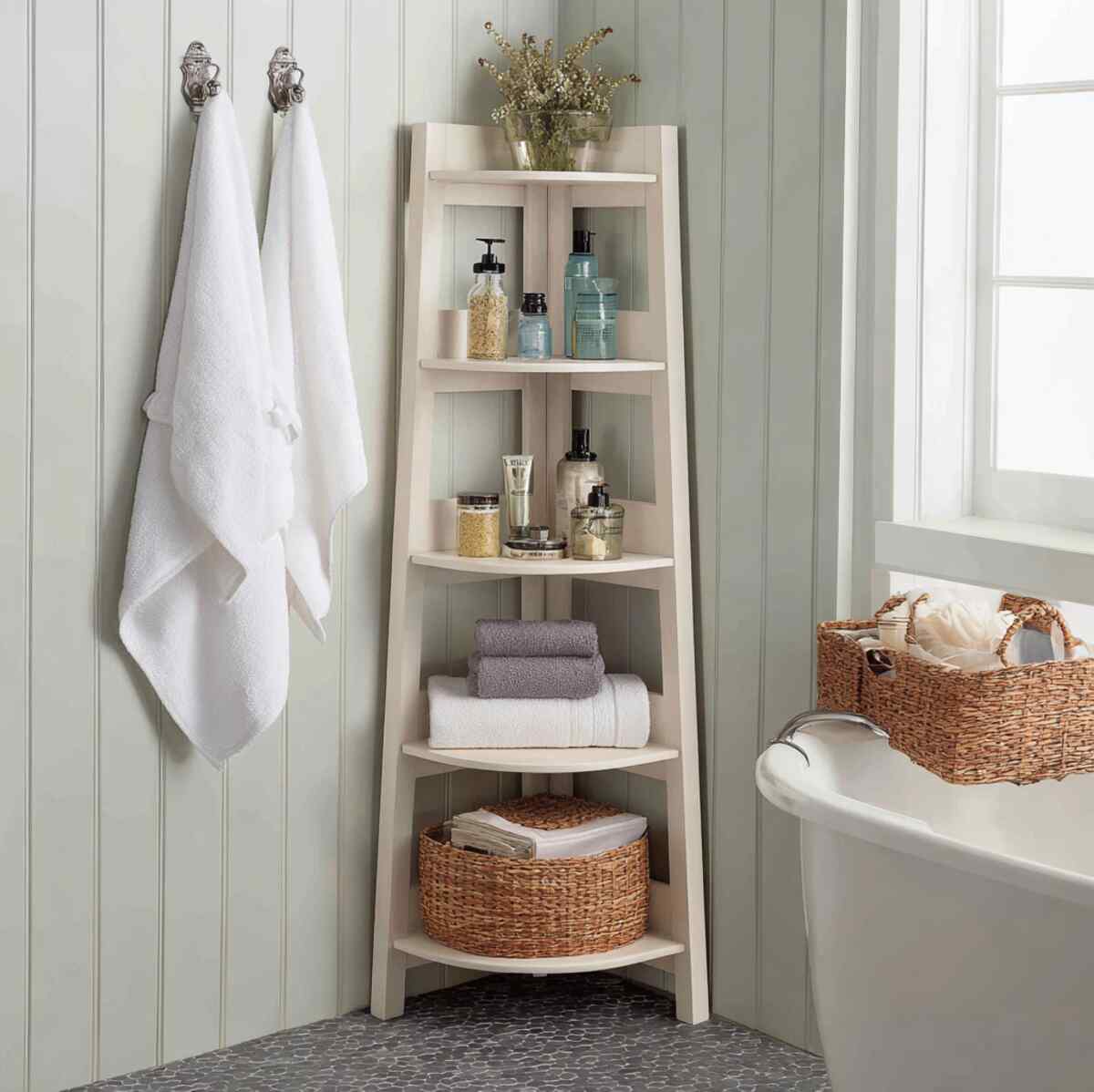Ladder-style units are stylish Corner Storage Tower Ideas for Bathrooms that lean neatly into corners.