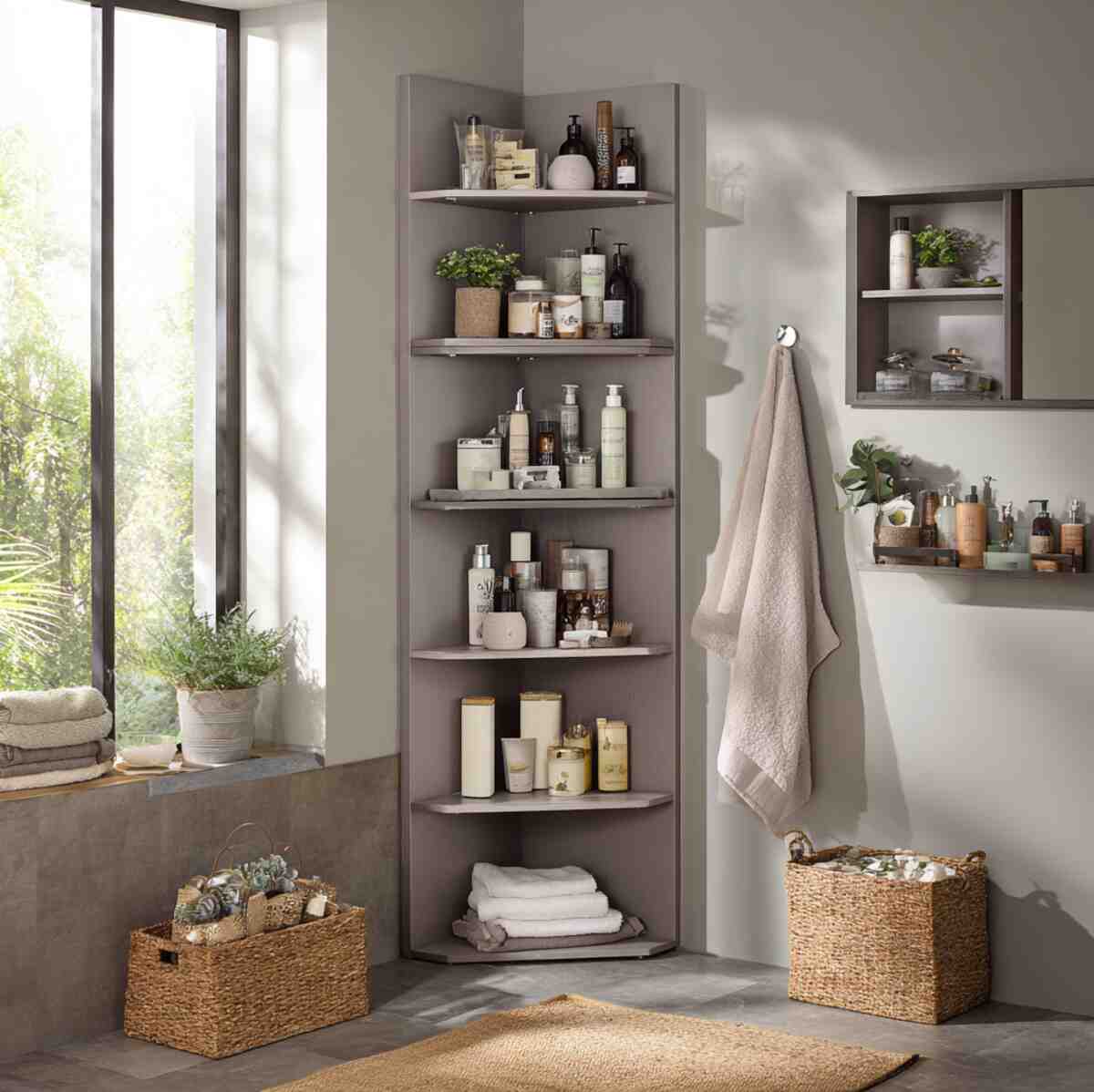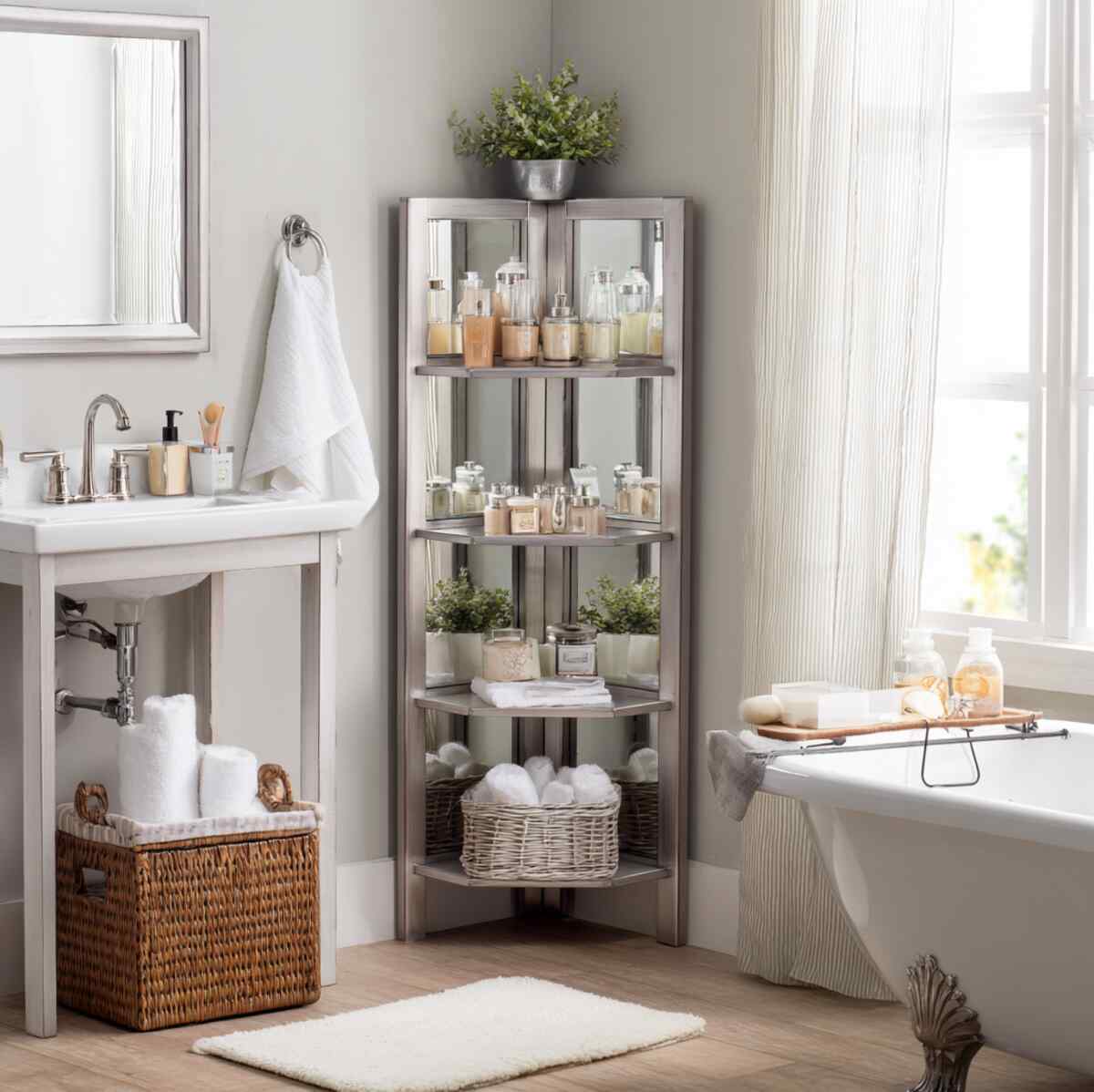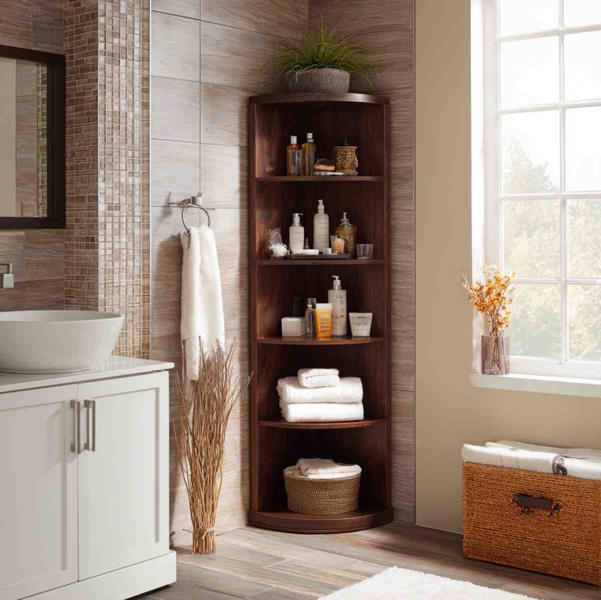 Mixed-shelf designs are versatile Corner Storage Tower Ideas for Bathrooms that balance display and hidden storage.
