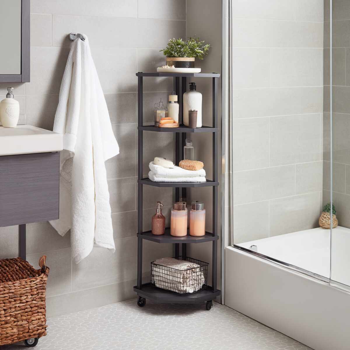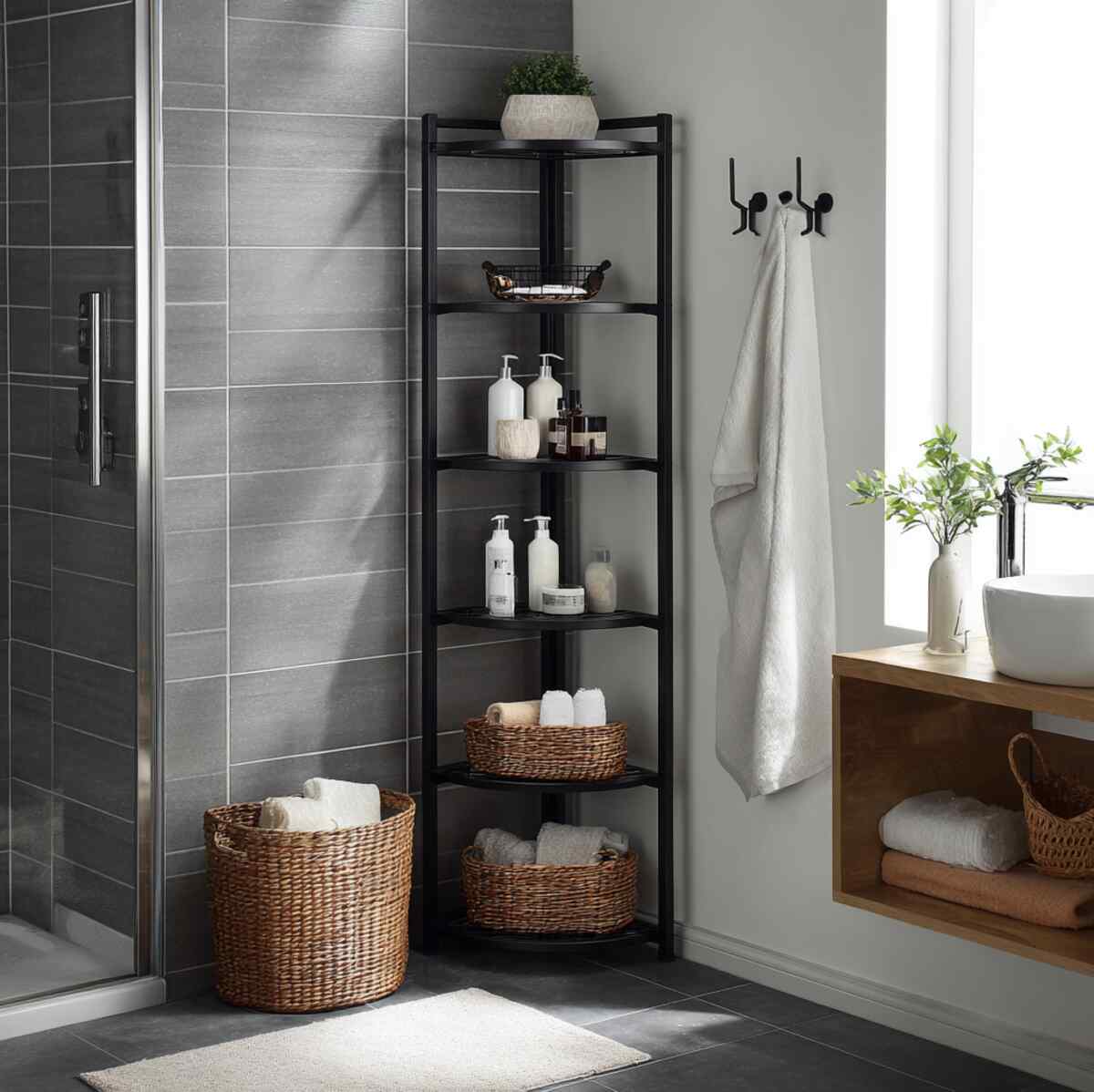 Metal frame designs are durable Corner Storage Tower Ideas for Bathrooms suited for humid environments.