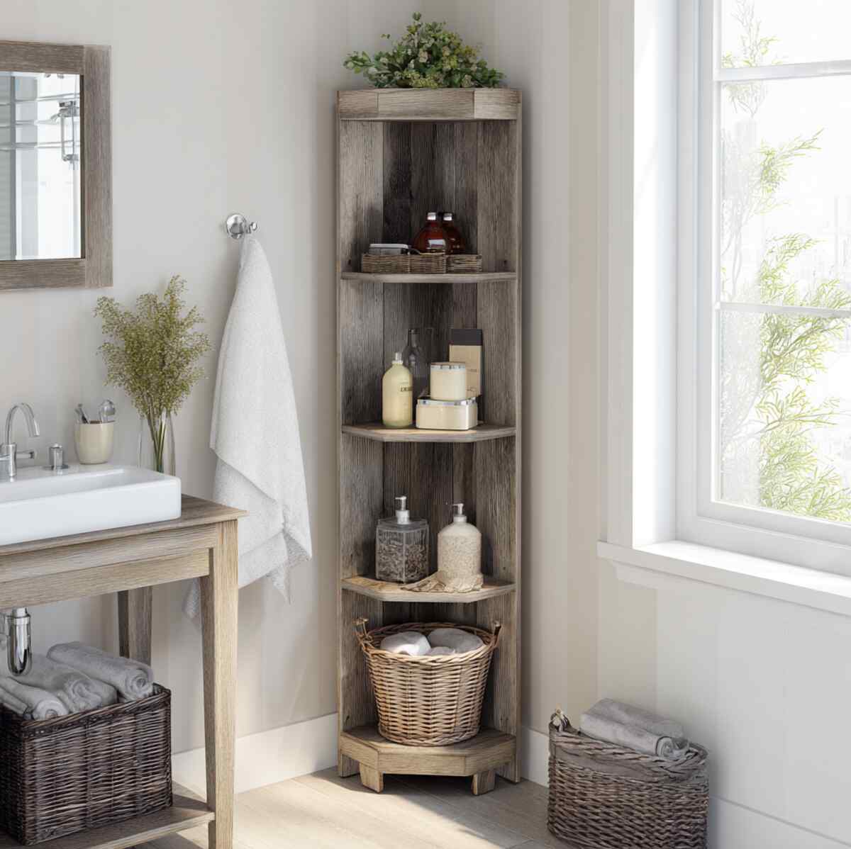 Rustic farmhouse styles are cozy Corner Storage Tower Ideas for Bathrooms that add charm and character.