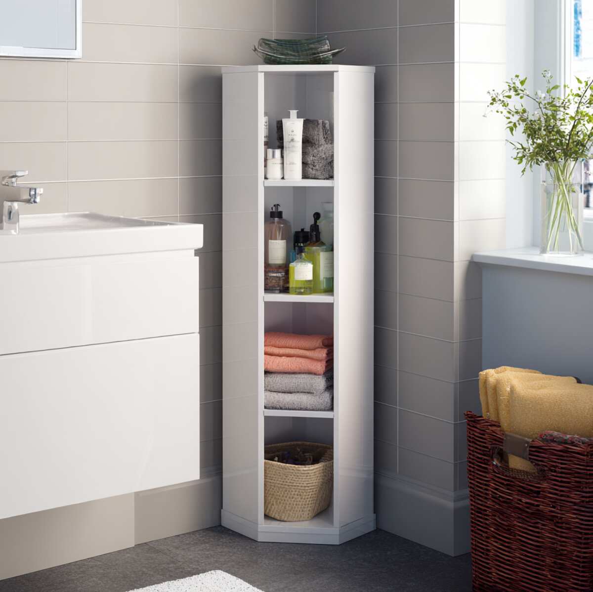 Wall-mounted options are space-saving Corner Storage Tower Ideas for Bathrooms that keep the floor clear.