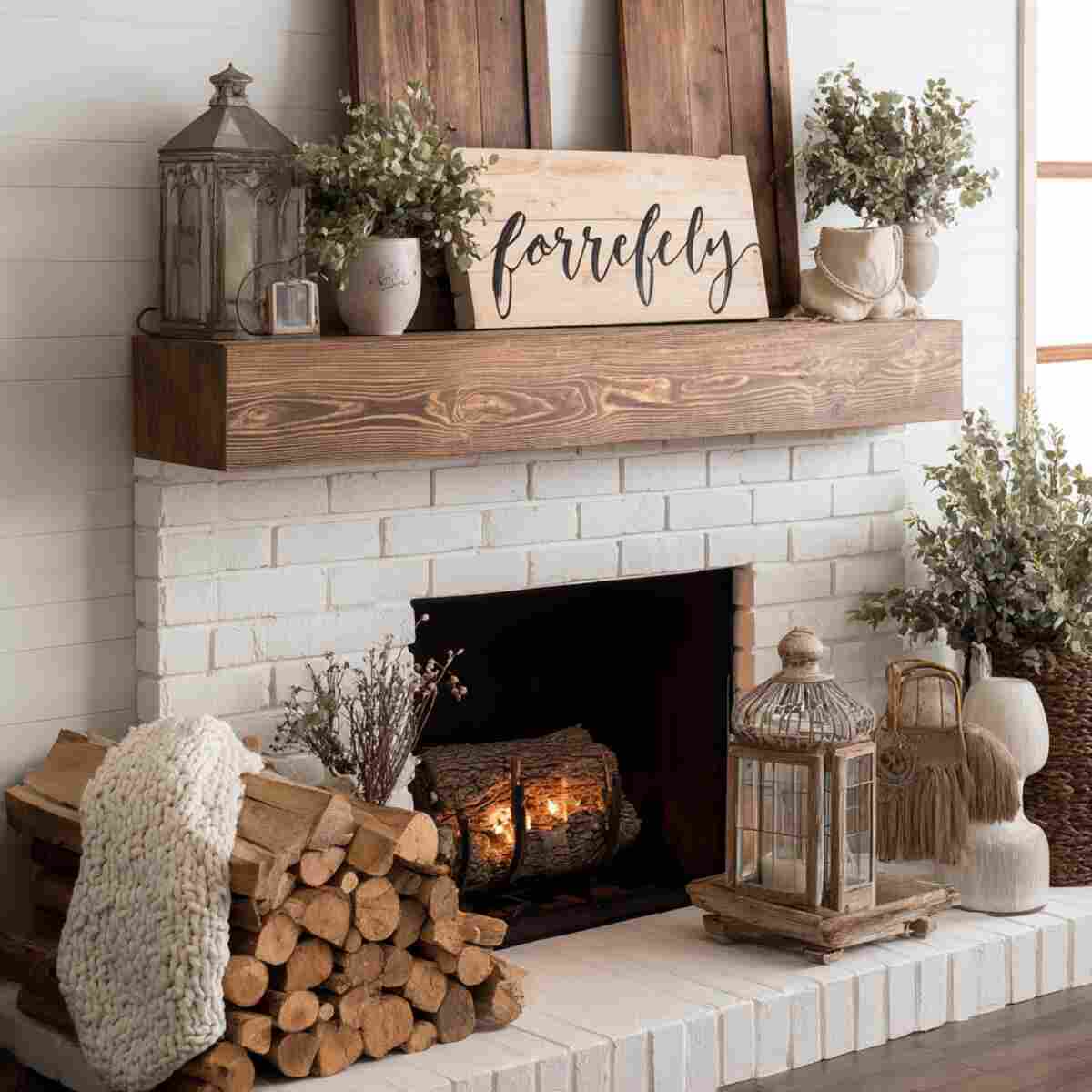 Rustic wooden signs are charming Cozy Fireplace Mantel Styling Ideas that add warmth through natural materials. Their imperfect textures and grain patterns enhance the cozy vibe.