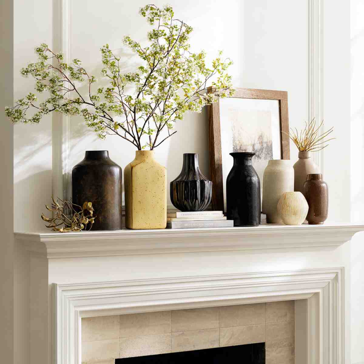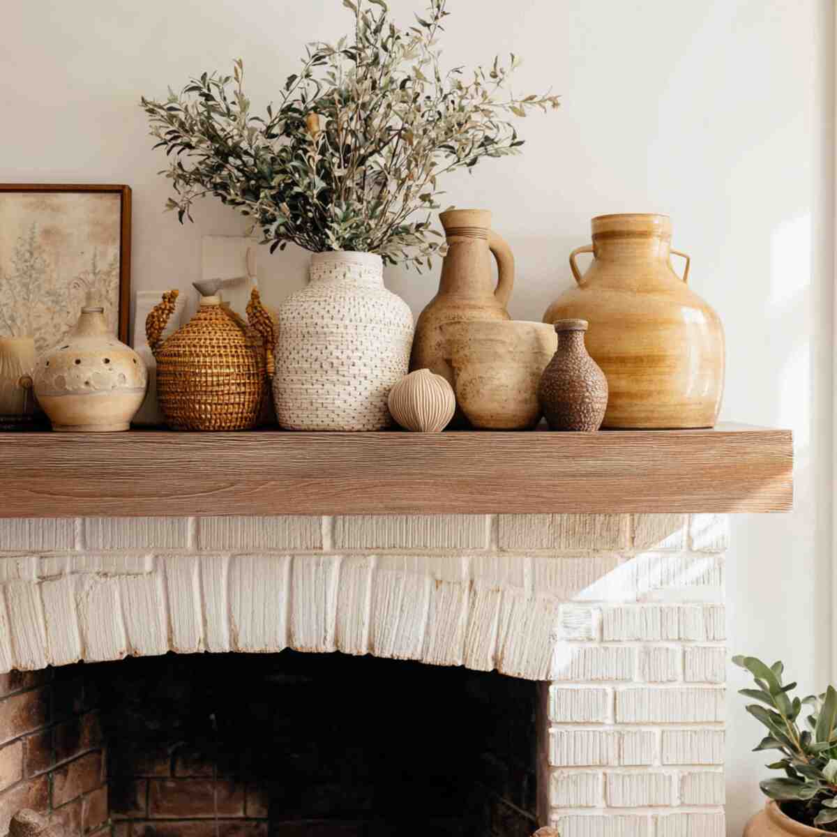 Neutral or earthy ceramics add warmth without looking cluttered. They help soften the mantel while maintaining a calm, cozy aesthetic.