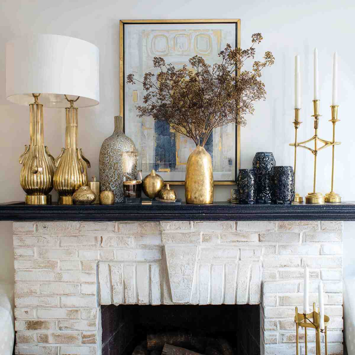 Brass or gold decor pieces are elegant Cozy Fireplace Mantel Styling Ideas that add warmth through metallic tones.