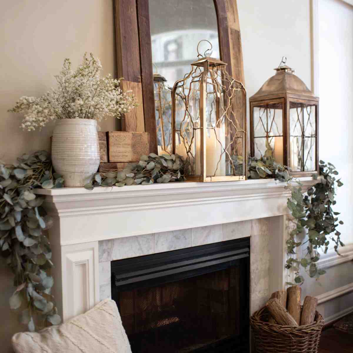 Whether lit or decorative, they create a welcoming glow. Lanterns visually connect the mantel to the fireplace’s comforting purpose.