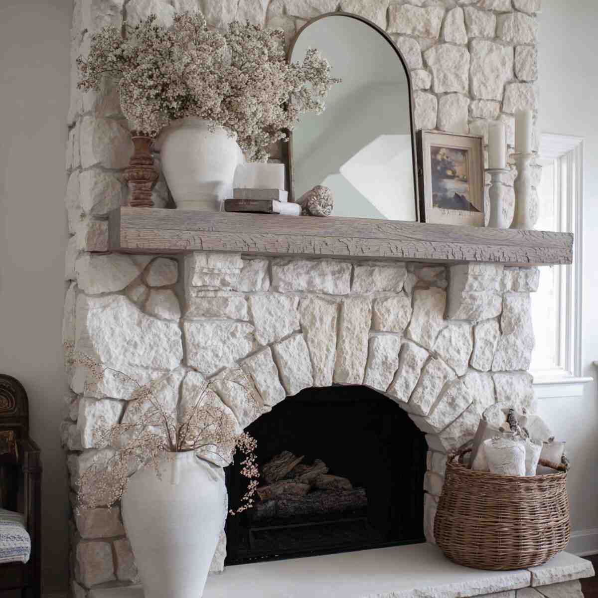 Natural stone accents are grounding Cozy Fireplace Mantel Styling Ideas that connect the space to nature.