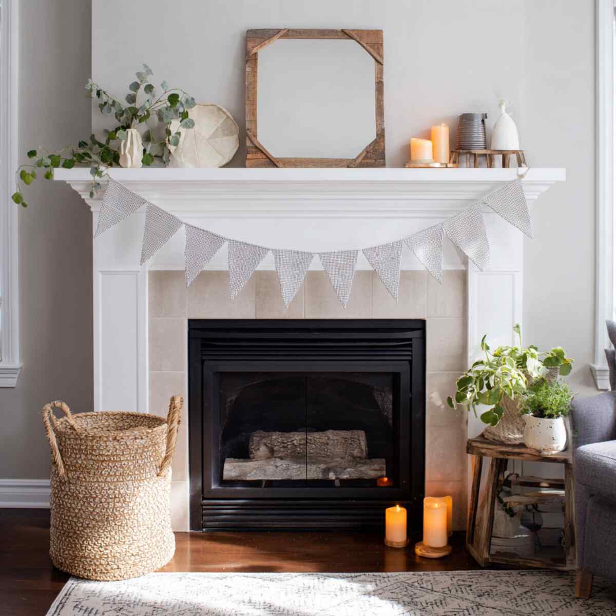 Soft fabric bunting is a playful take on Cozy Fireplace Mantel Styling Ideas that adds texture and warmth.