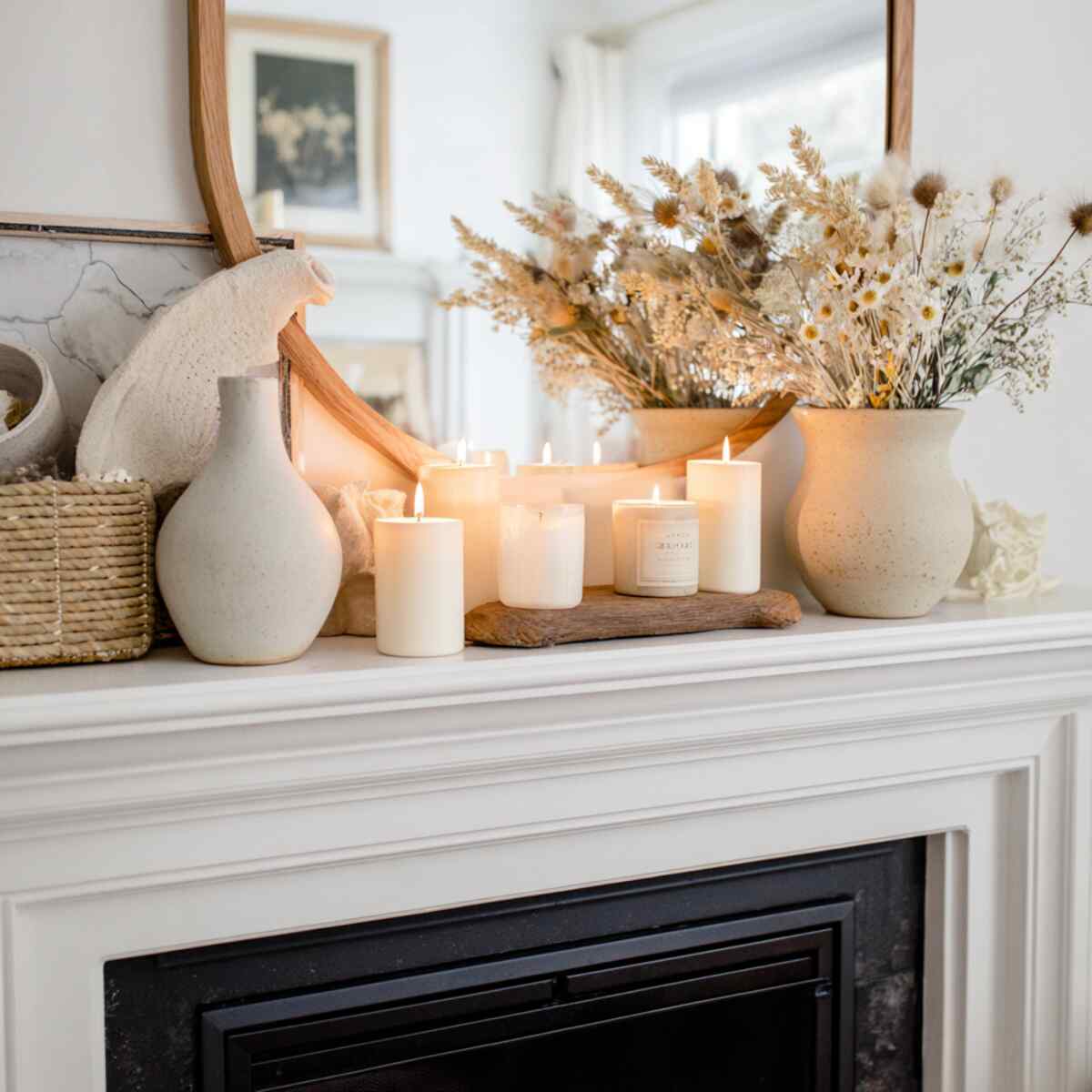 Soft neutral candles are essential Cozy Fireplace Mantel Styling Ideas because they provide gentle lighting without overwhelming the space.