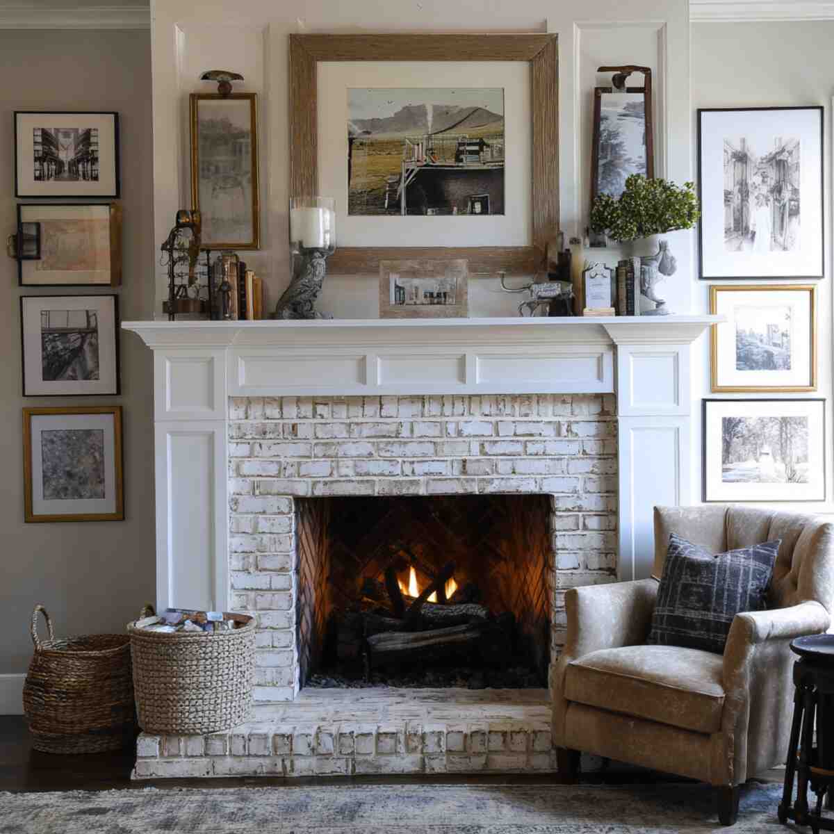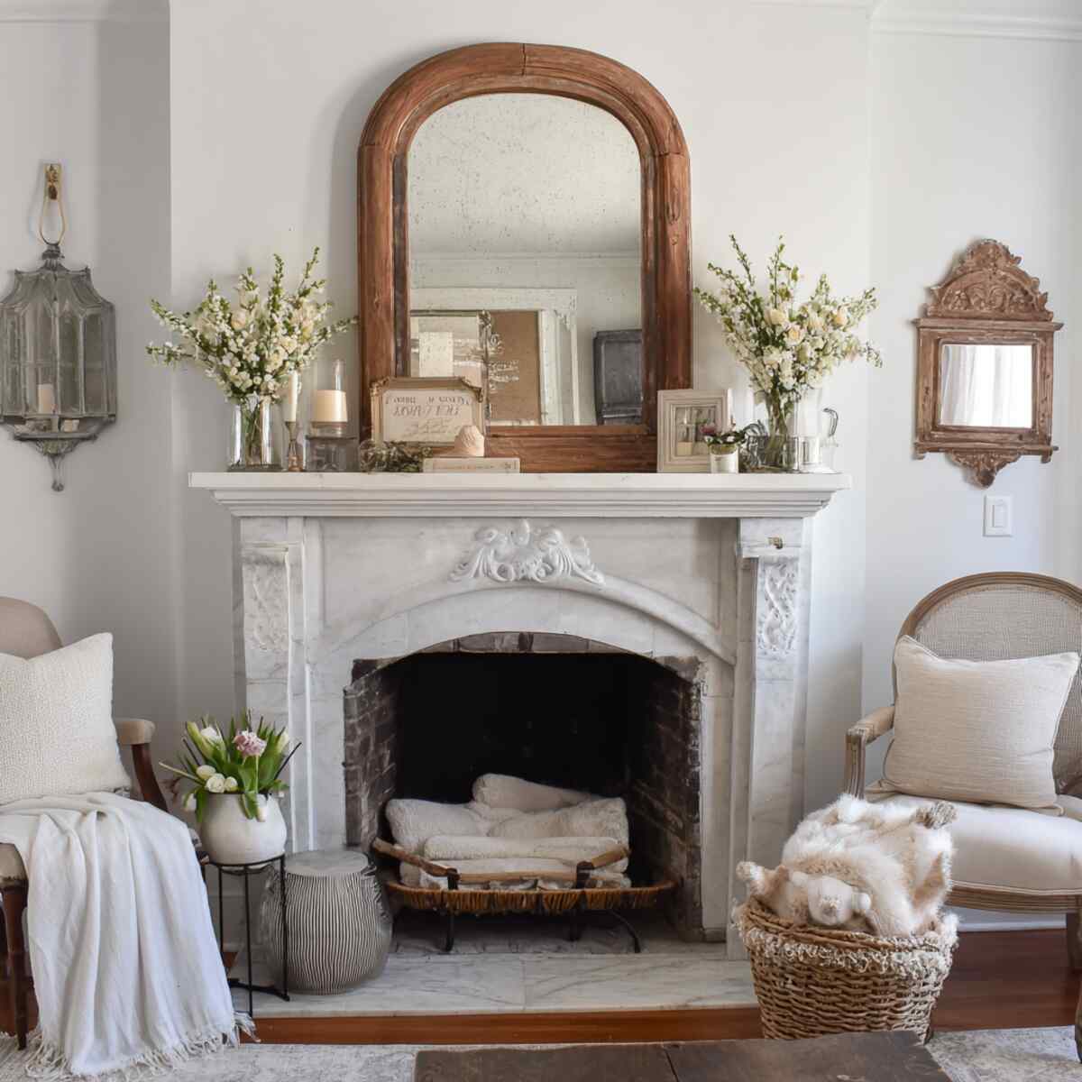 Their aged finishes add charm and character that modern decor often lacks. Placing a mirror above the mantel helps anchor the entire fireplace area visually.