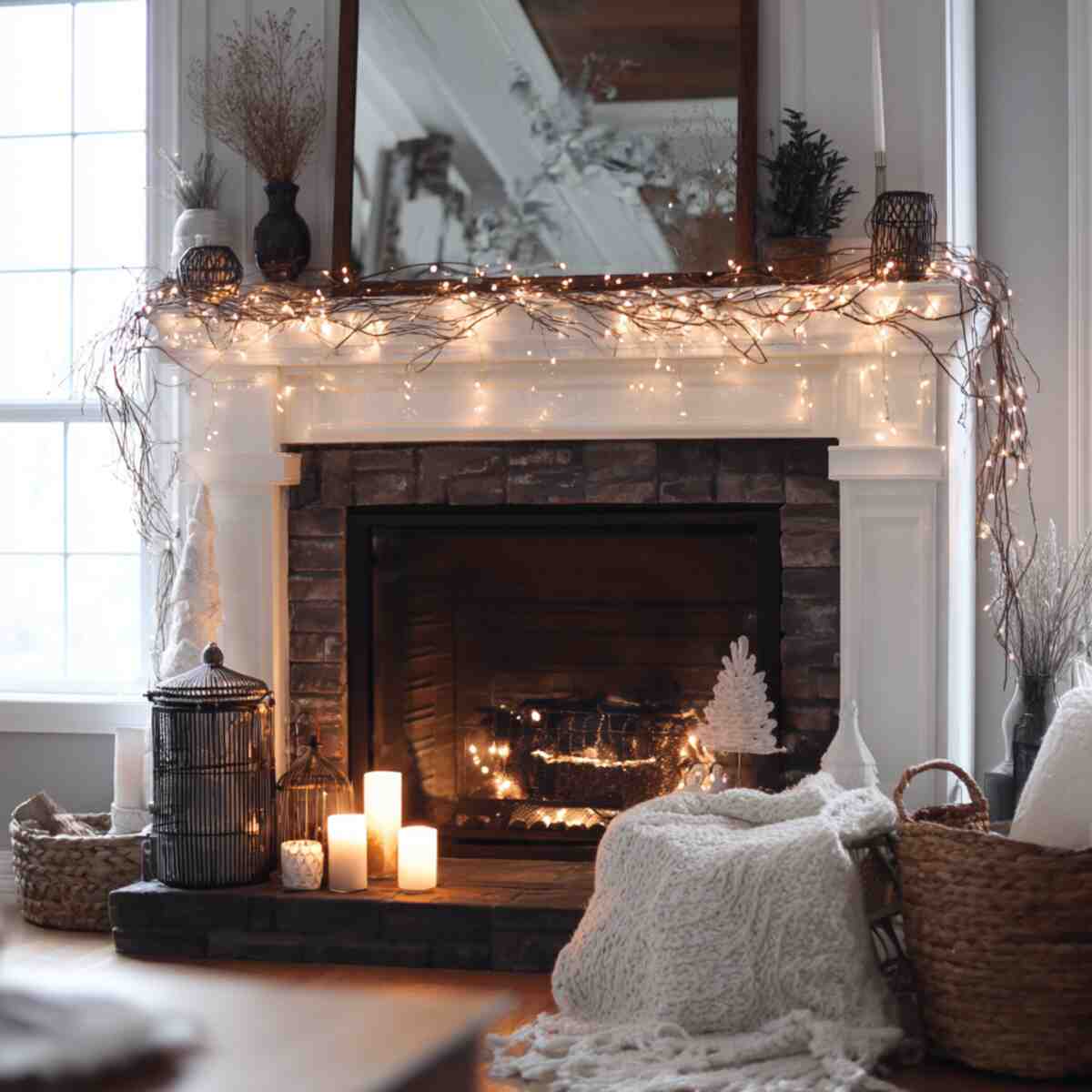 Their soft glow adds warmth without competing with the fireplace itself. Draped gently, they create a comforting and magical mantel display.